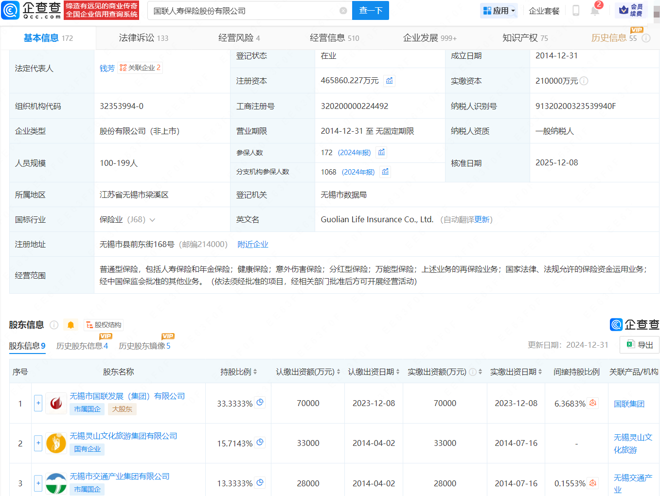企查查APP显示,近日,国联人寿保险股份有限公司发生工商变更,注册资本由21亿元增至约46.6亿元,增幅约122%,同时,法定代表人及多位主要人员发生变更。企查查信息显示,该公司成立于2014年12月,法定代表人为钱芳,经营范围包含普通型保险,包括人寿保险和年金保险;健康保险等,由无锡市国联发展(集团)有限公司、无锡灵山文化旅游集团有限公司等共同持股。