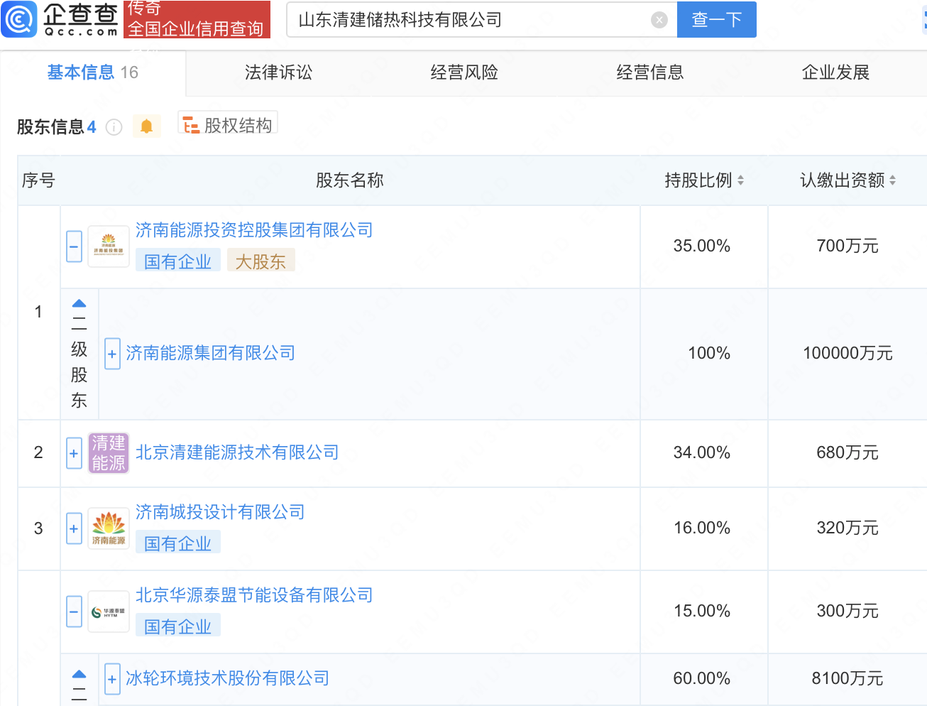 企查查APP显示,近日,山东清建储热科技有限公司成立,注册资本2000万元,经营范围包含:特种设备设计;燃气经营;热力生产和供应;发电业务、输电业务、供(配)电业务等。企查查股权穿透显示,该公司由冰轮环境(000811)旗下北京华源泰盟节能设备有限公司、济南能源集团有限公司全资子公司济南能源投资控股集团有限公司等共同持股。