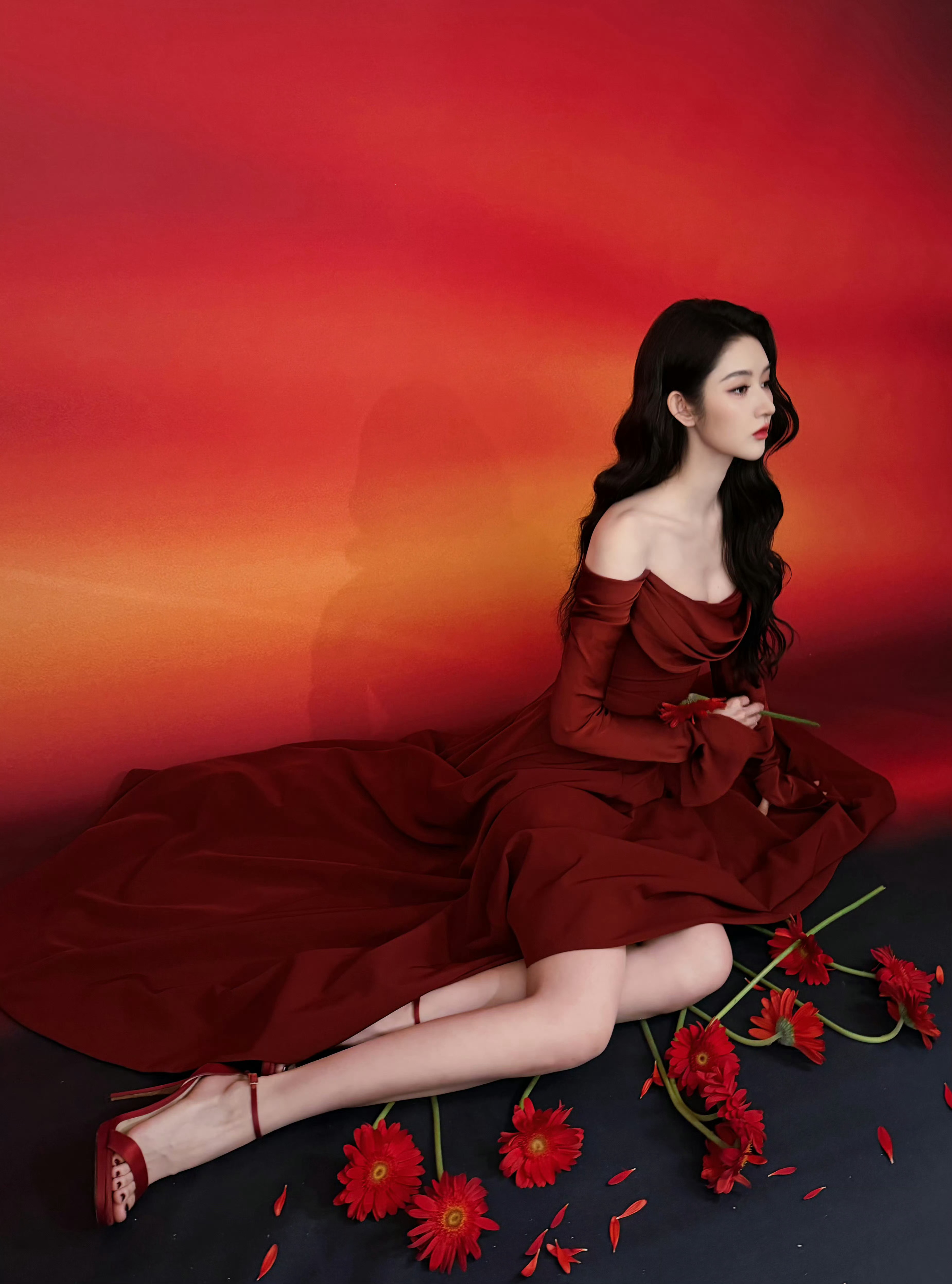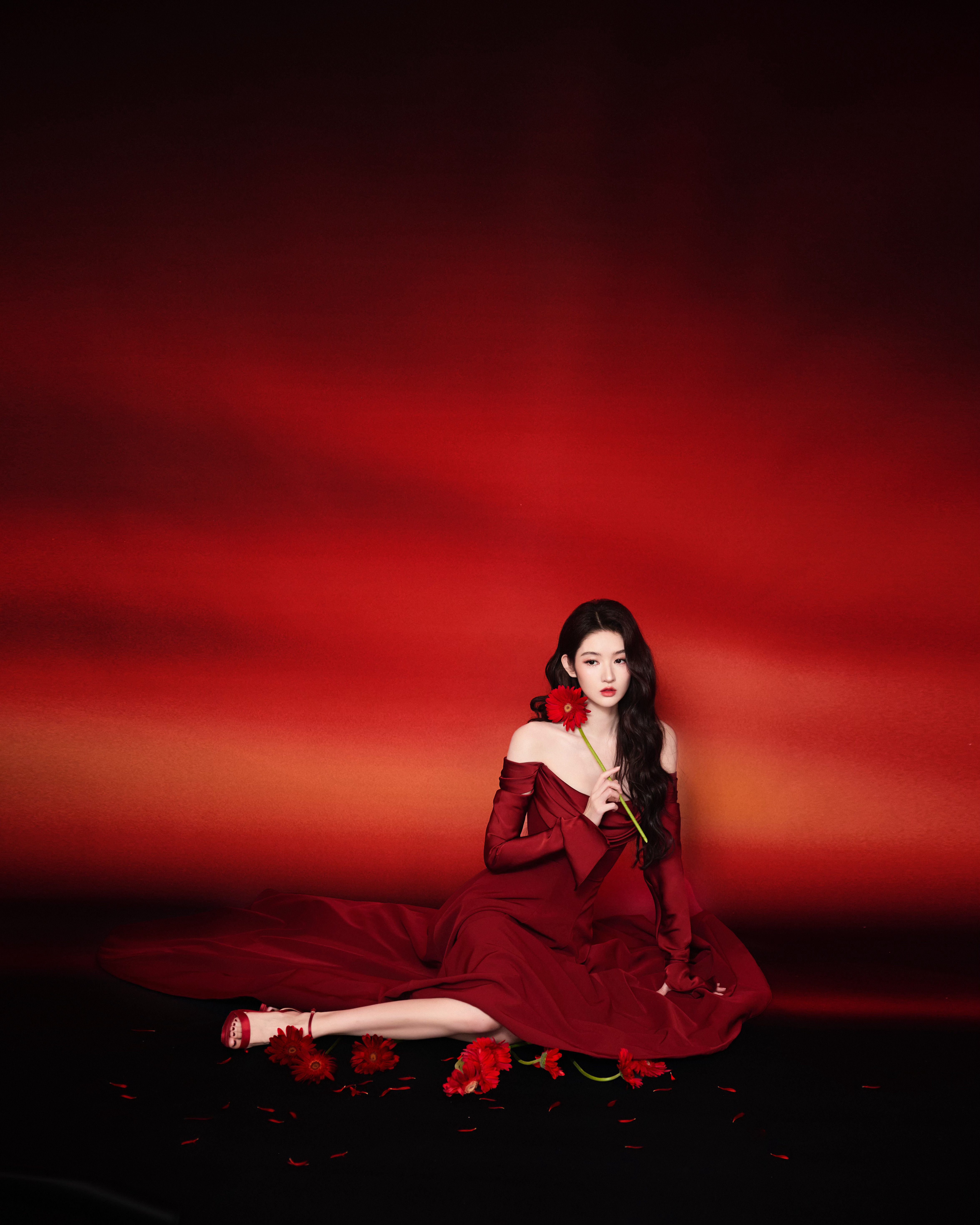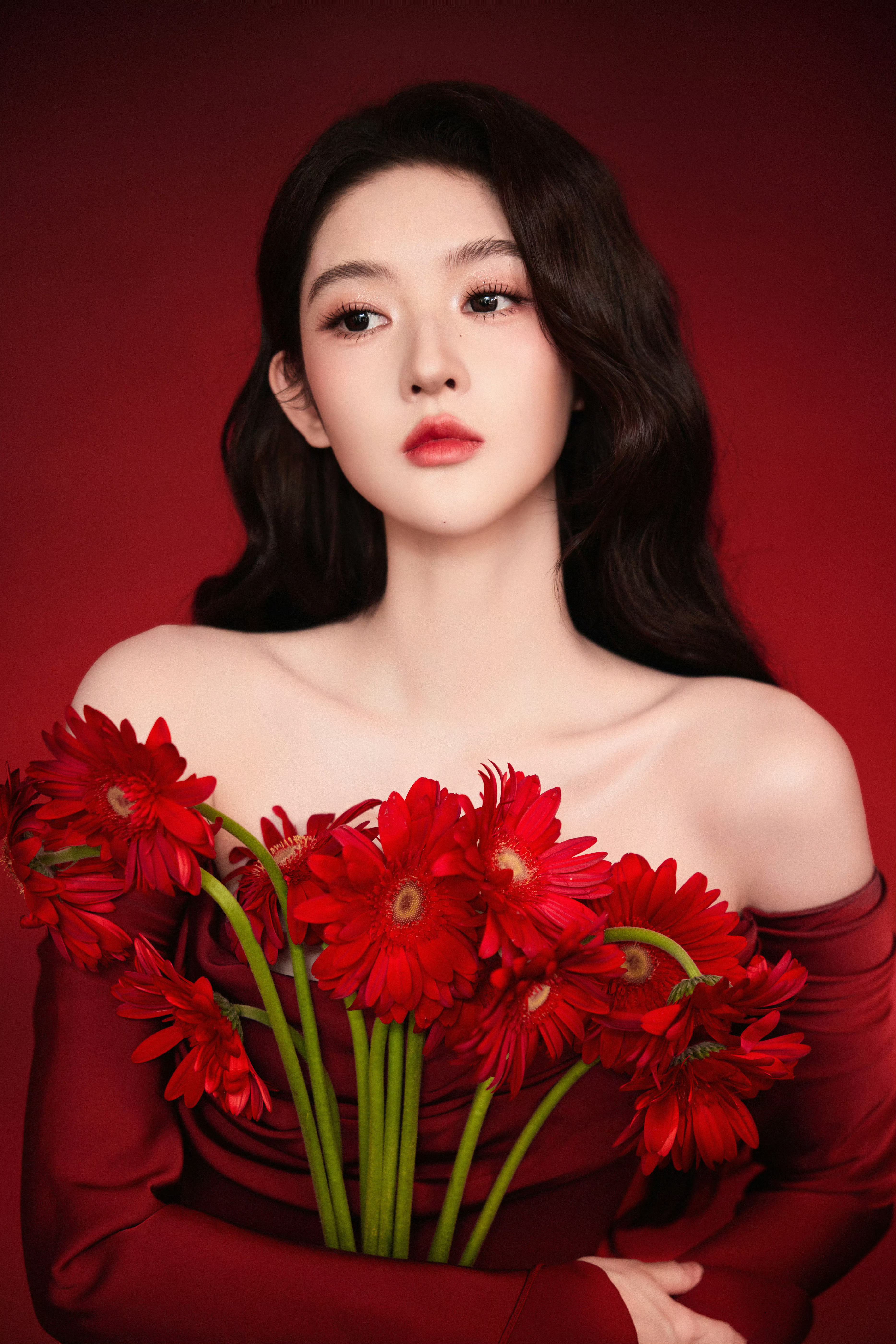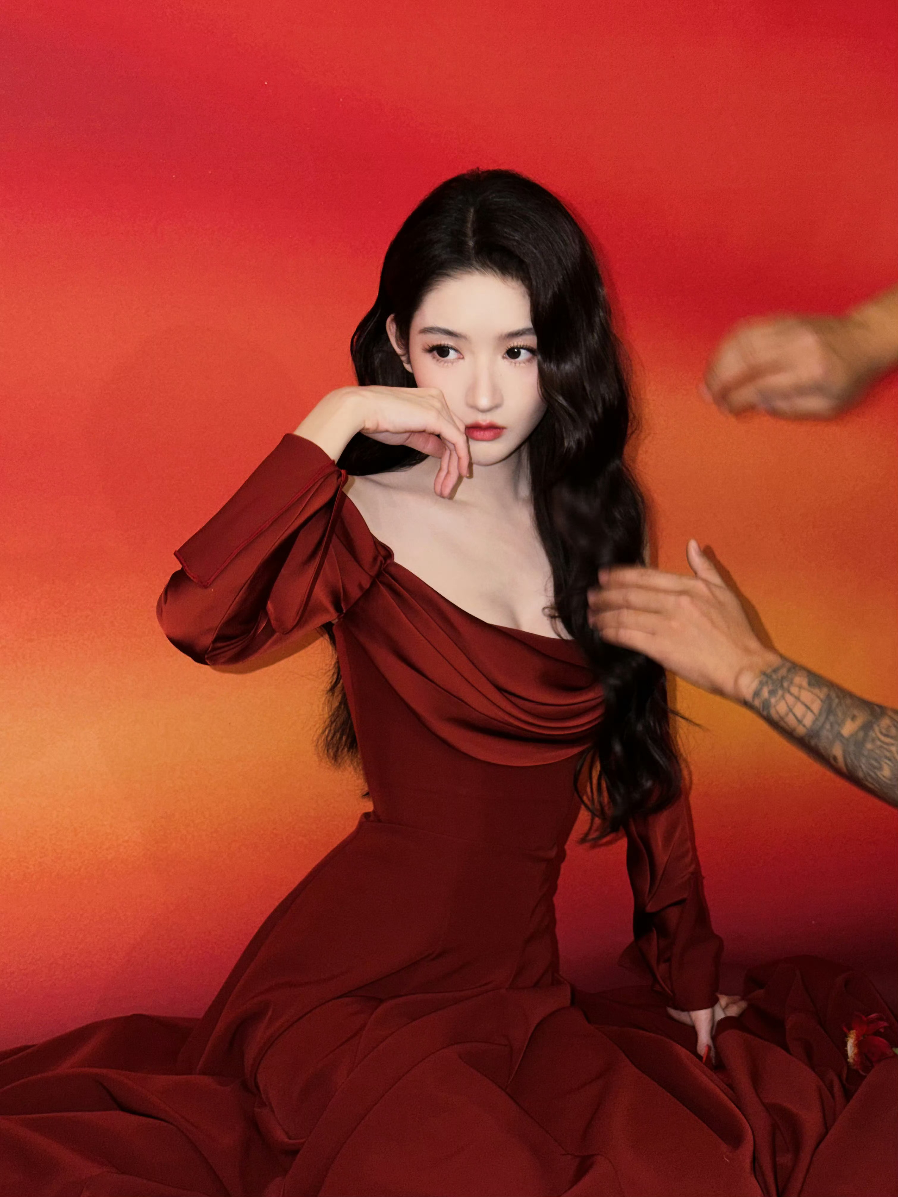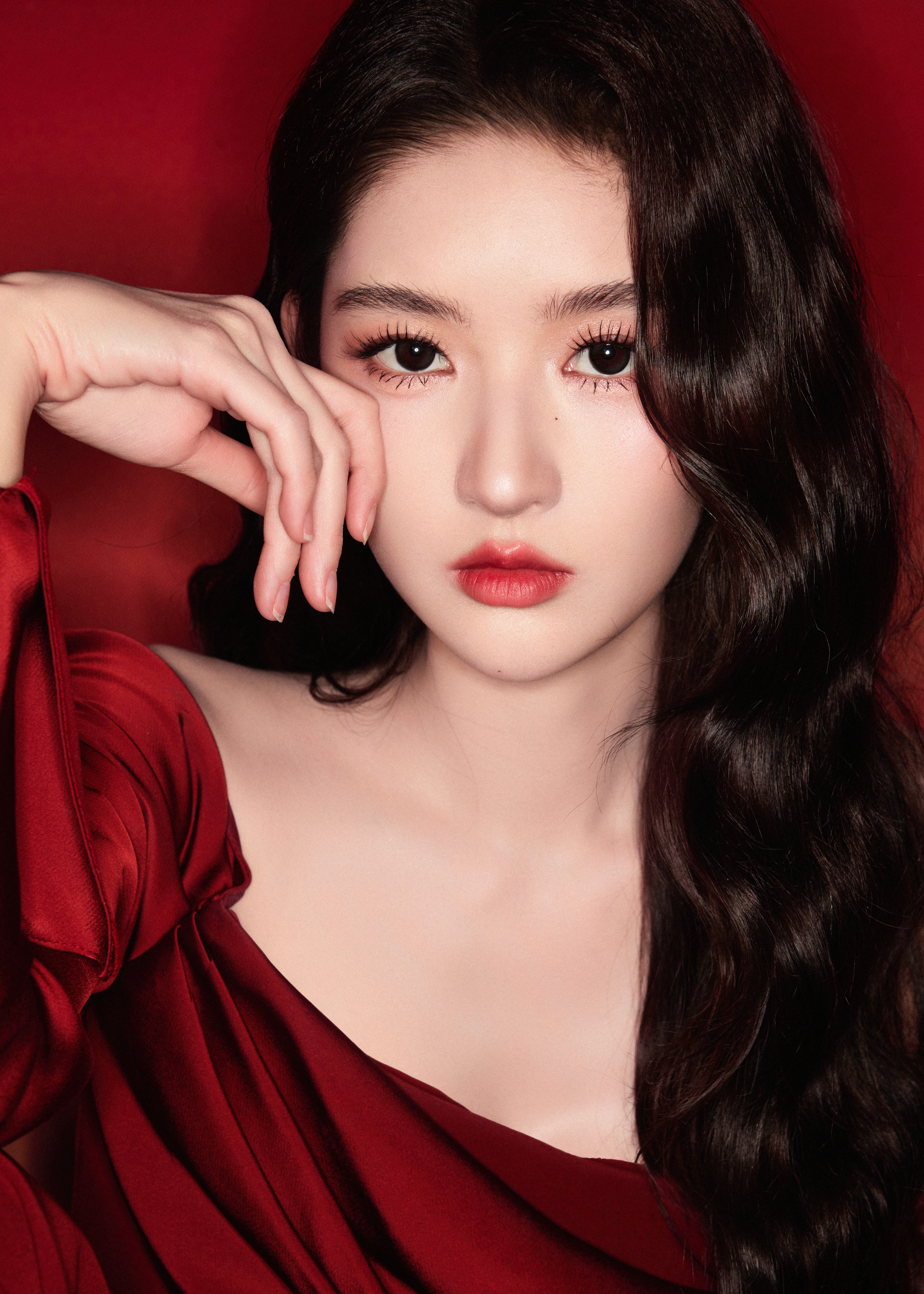 模特深红色浓密高颅顶直发配钻石发饰,着红钻高定礼服,系钻石腰链,拎红钻手包,踩浅