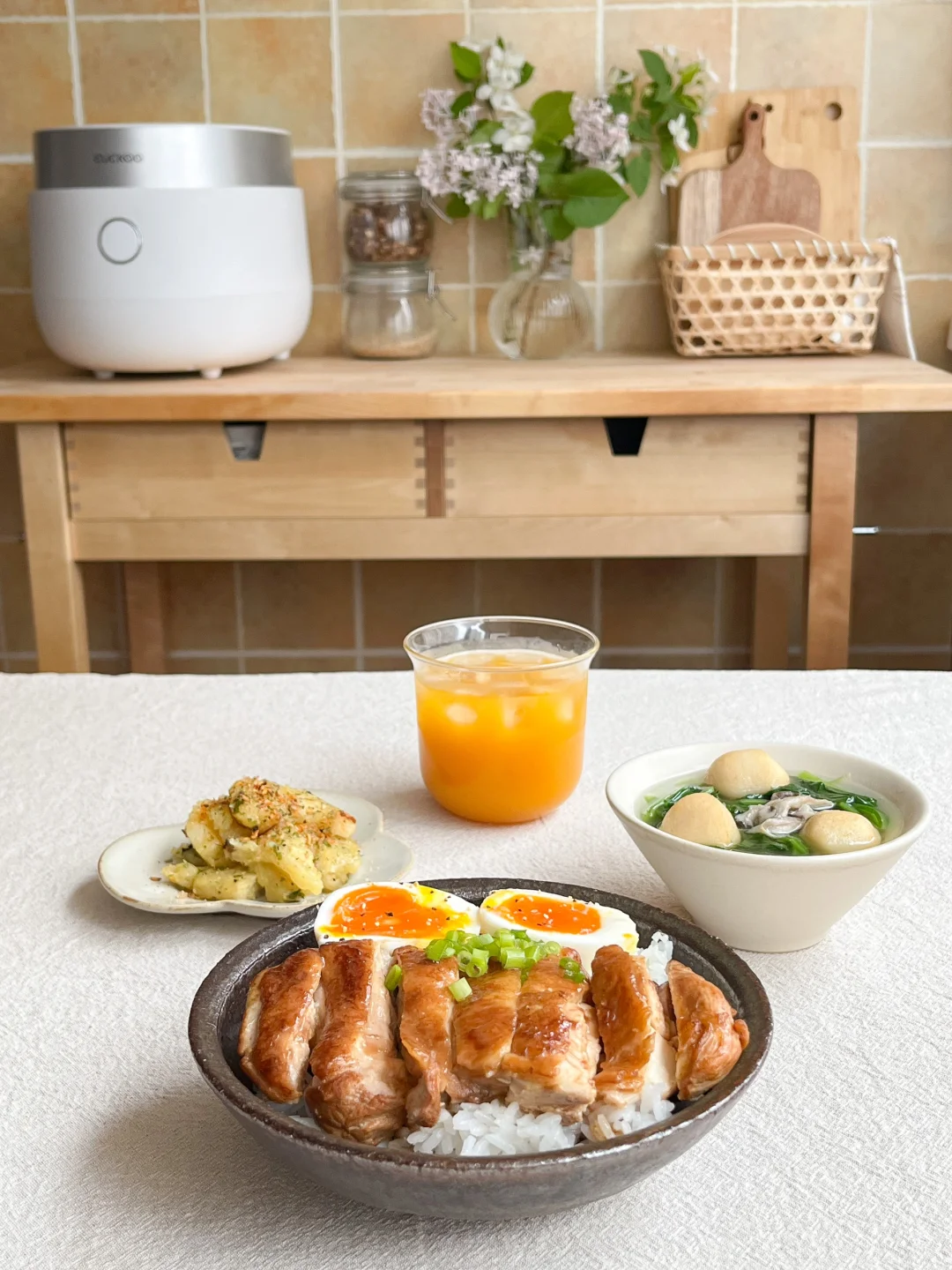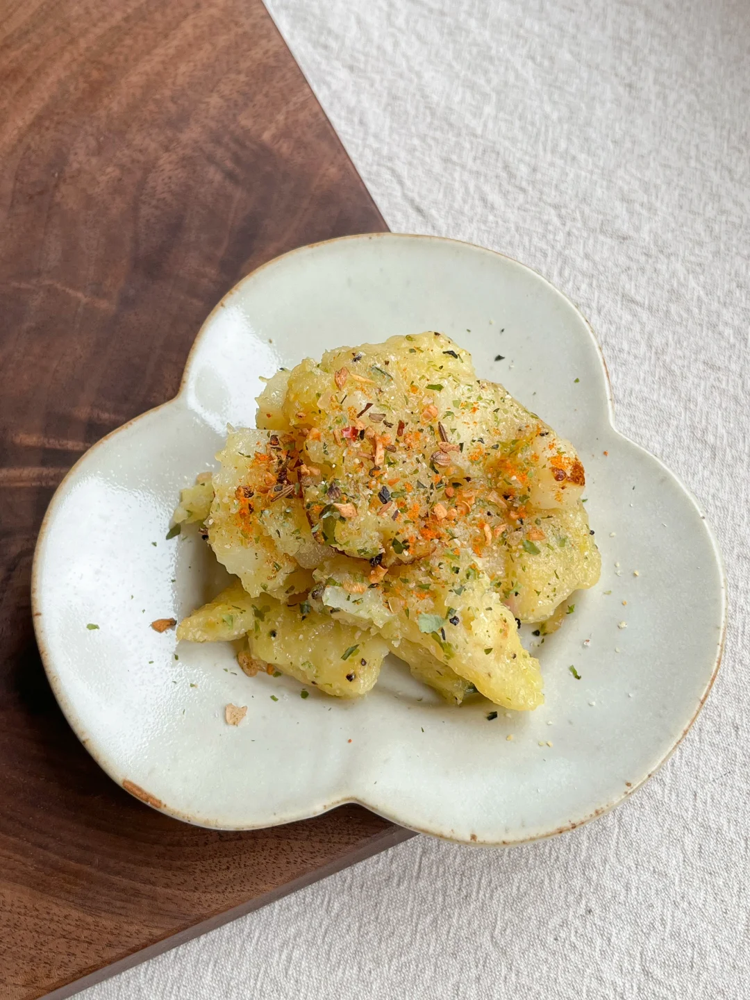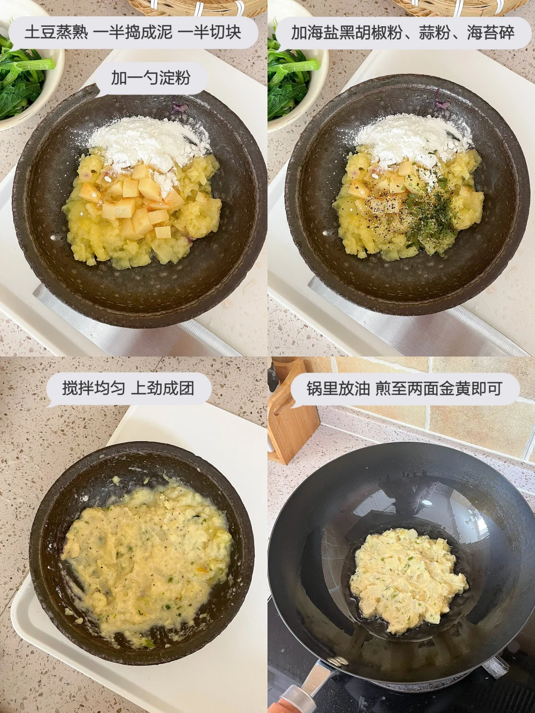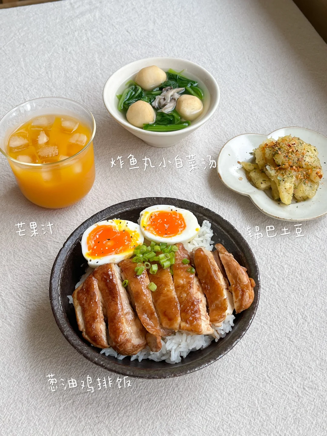 今日午餐: 葱油鸡腿饭🍗 锅巴土豆🍟 小白菜炸鱼丸汤🥣 芒果汁🍹 要说我喜欢的蔬菜 土豆应该能排上☝️ 今天做了一个夜市同款锅巴土豆 土豆蒸熟捣成泥 再放点小颗粒土豆 一勺淀粉 海盐黑胡椒粉 蒜粉 海苔碎 用平底锅煎熟 用不粘锅 不粘锅 把两面都煎的焦焦脆脆的 铲子切大块 撒点辣椒粉、椒盐 还原度还是不错的 就是我低估了土豆和淀粉的粘锅能力 嘎巴的昏天黑地啊 不吃饱饭都刷不动锅[笑哭R]