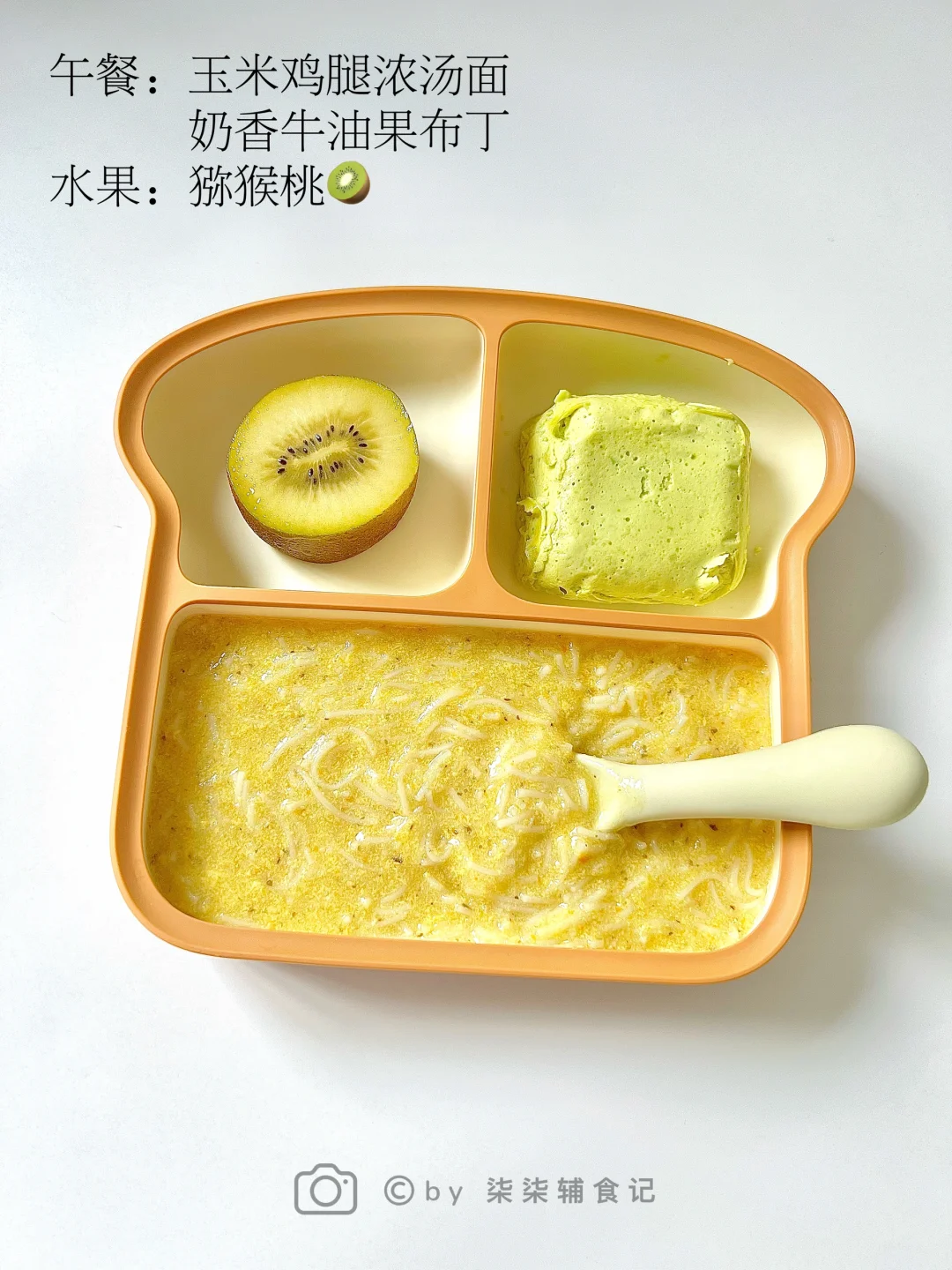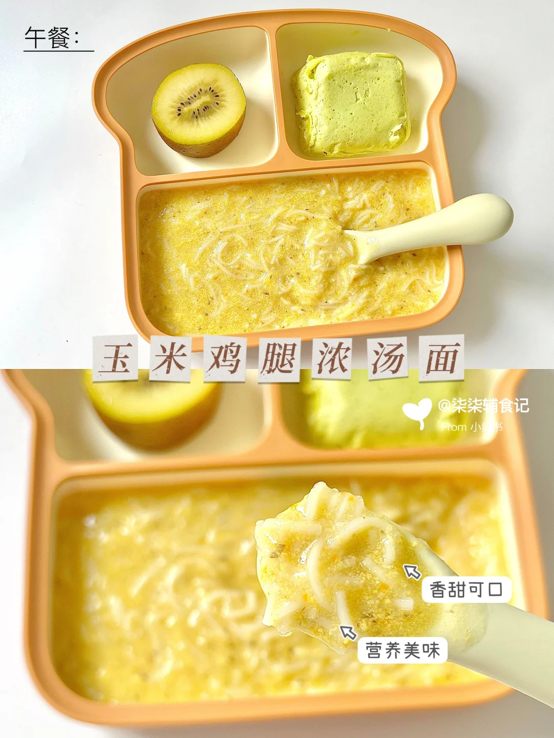 👧:10个月➕9天 ⏰:午餐11:30 🥣:玉米鸡腿浓汤面 🤌:奶香牛油果布丁 🍽️:水果:猕猴桃🥝 ⏰:晚餐18:00 🥣:丝瓜肉末粥 午餐吃玉米鸡腿浓汤面和牛油果布丁,今日的辅食太合胃口啦!居然能全部吃光光~浓汤宝好百搭,怎么煮都好吃😋 晚餐丝瓜肉末粥,营养辅食一锅炖,方便又快捷~ 今天的辅食真省事😁😁 柒柒今天也有在乖乖吃饭呀! ⚠️食材分量根据宝宝的食量添加。 ⚠️食材大小根据宝宝的咀嚼能力处理。