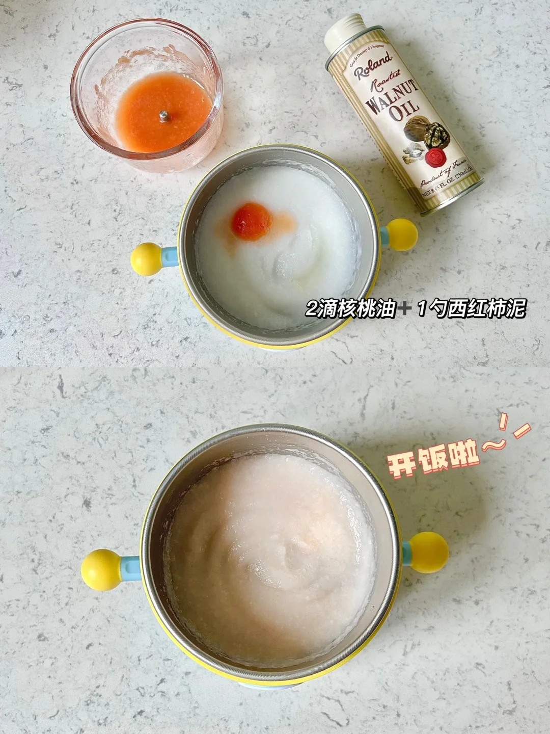 📝:7.5米粉➕70ml水,2滴核桃油➕1勺西红柿泥