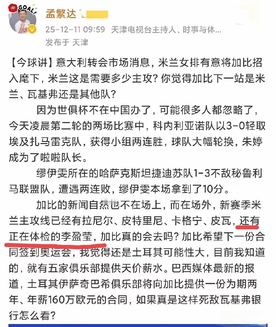 网传米兰将签下巴西国家队队长加比,李盈莹或又多了一个竞争对手 据意大利转会市场消息,意大利米兰队有意将巴西国家队队长、现效力于意大利科内利亚诺的主力主攻加比招入,目前正委派经纪公司与加比接触。如果引援成功,米兰队原有拉尼尔、皮特里尼、卡格尼、皮瓦等四名主攻,加上加比,主攻人数将达到5人,还不包括正在米兰队门外排队“体检”的天津女排队长李盈莹。 这一消息,天津电视台体育频道主持人、解说员孟繁达也发抖音转述了这一消息。不过孟主持认为,加比加盟米兰的可能性不大,原因是土耳其伊萨奇巴希队也想引进加比,并且开出了天价160万欧元的薪酬。 米兰队已经有4名主攻了,已经饱和了,还这山望着那山高,又看上了加比!这对于正在门外排队“体检”的李盈莹来说,真是雪上加霜。笔者倒是认为,这米兰队太不厚道了!既然你已经看中了李盈莹,你怎么吃着碗里还望着锅里呢?球迷朋友们,你们怎么看? 福建 天津 江苏 上海 河南 中国女排