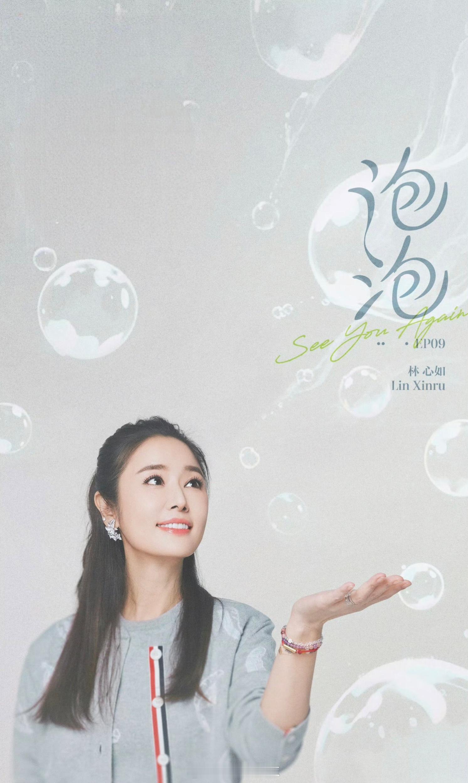 林心如 浅灰开衫裹着松弛感,红白条纹纽扣藏着小俏皮,抬手轻接泡泡的瞬间,连笑容都