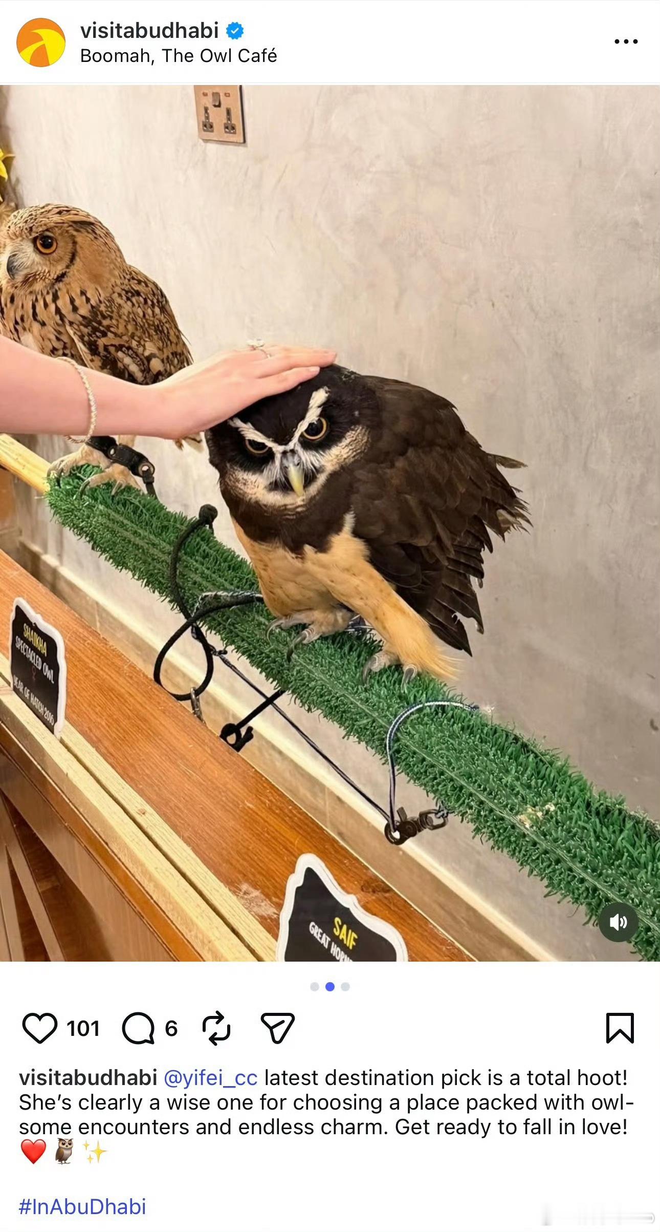 阿布扎比旅游局官方IG再次更新,分享了刘亦菲在猫头鹰咖啡馆的打卡之行哈哈哈,阿布