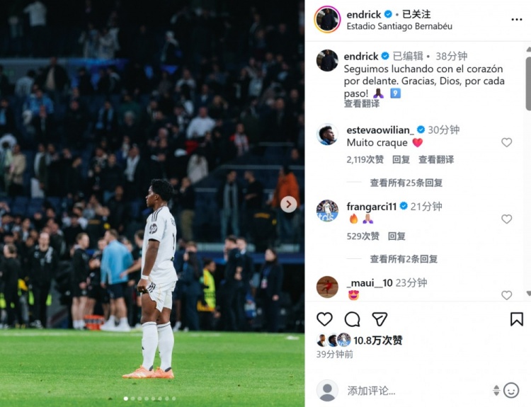 本场比赛恩德里克替补登场,他也在个人社媒晒出本场照片,配文写道:“我们将继续全力以赴地战斗。感谢上帝一路以来的指引!”