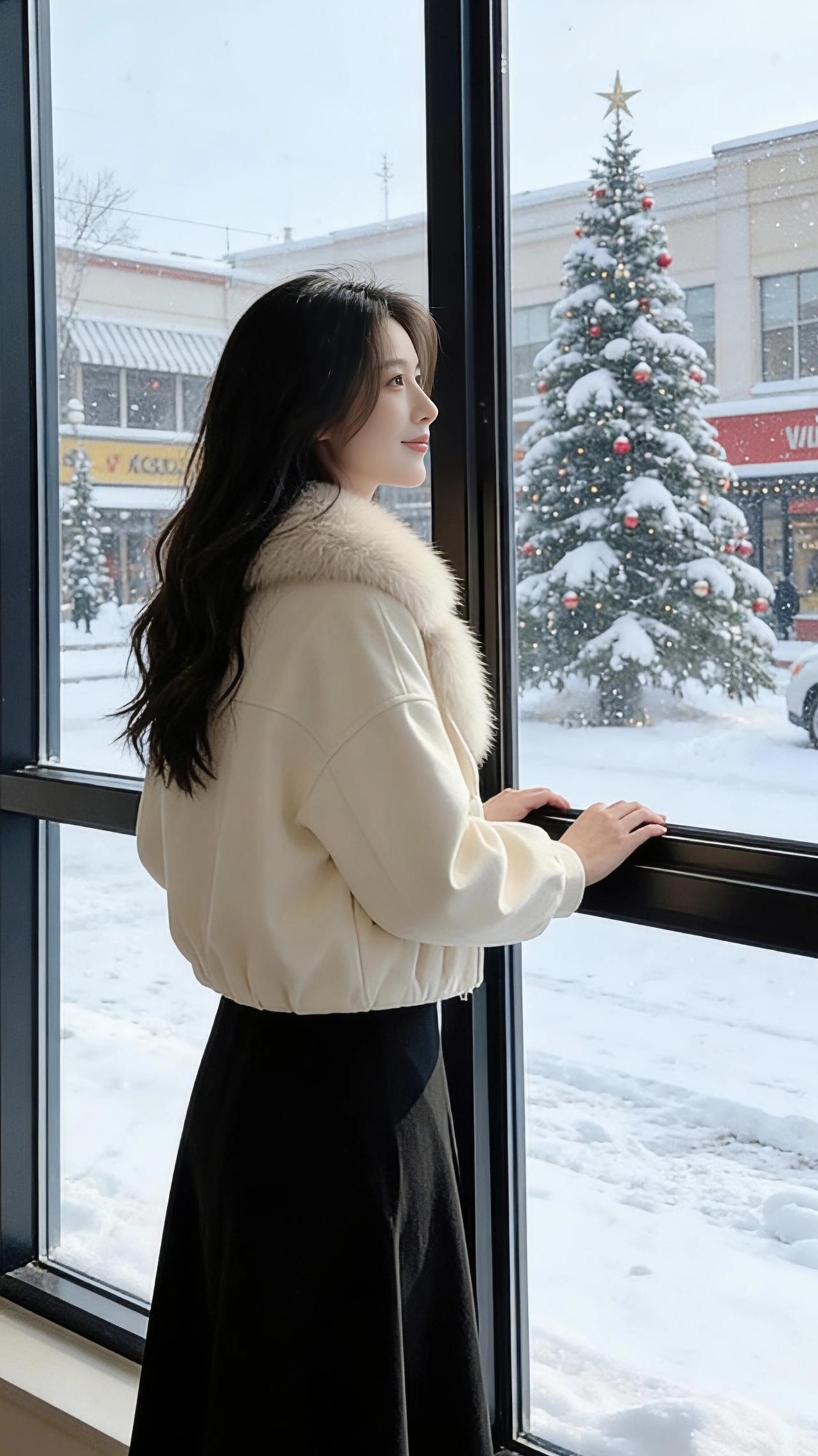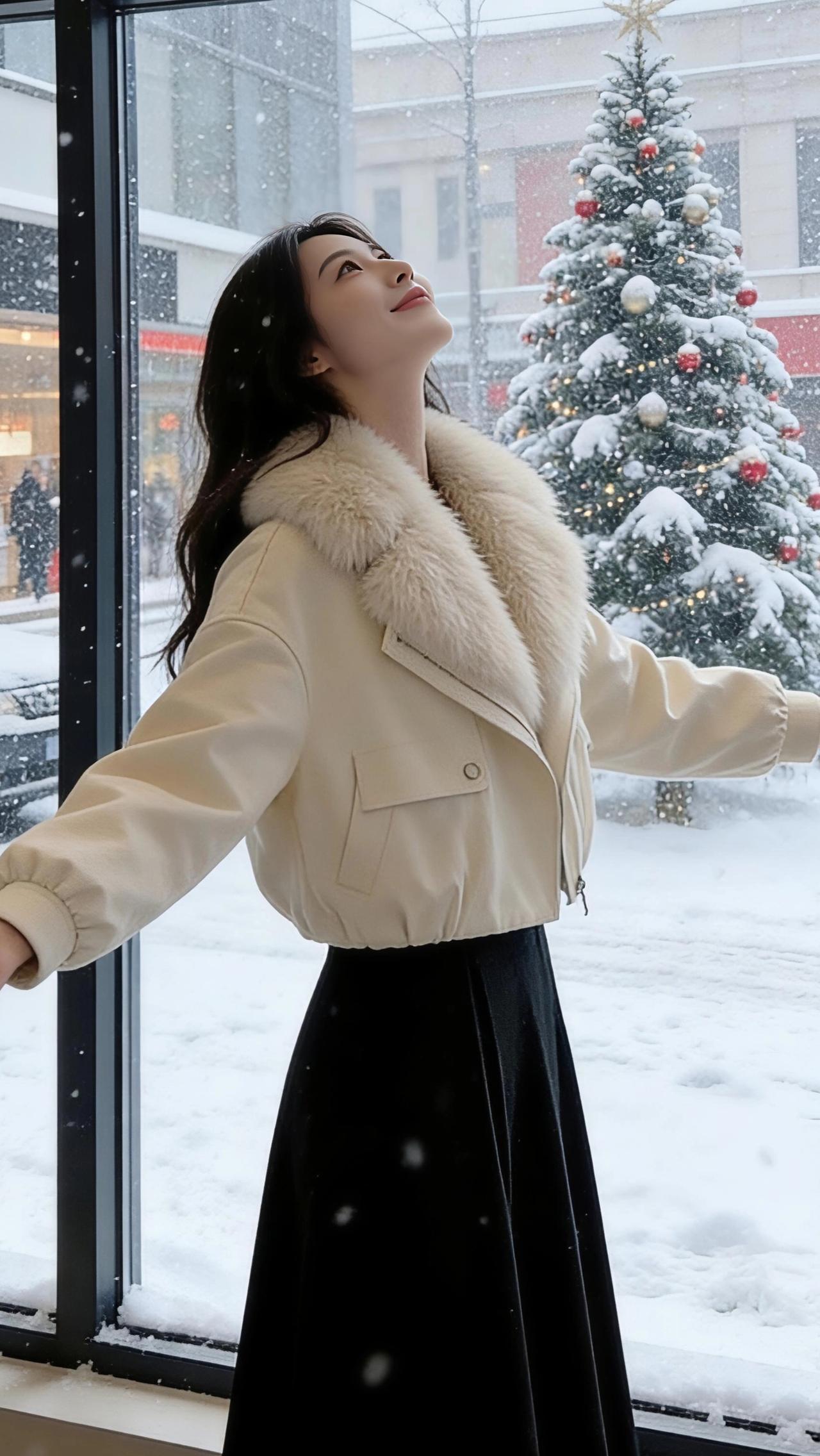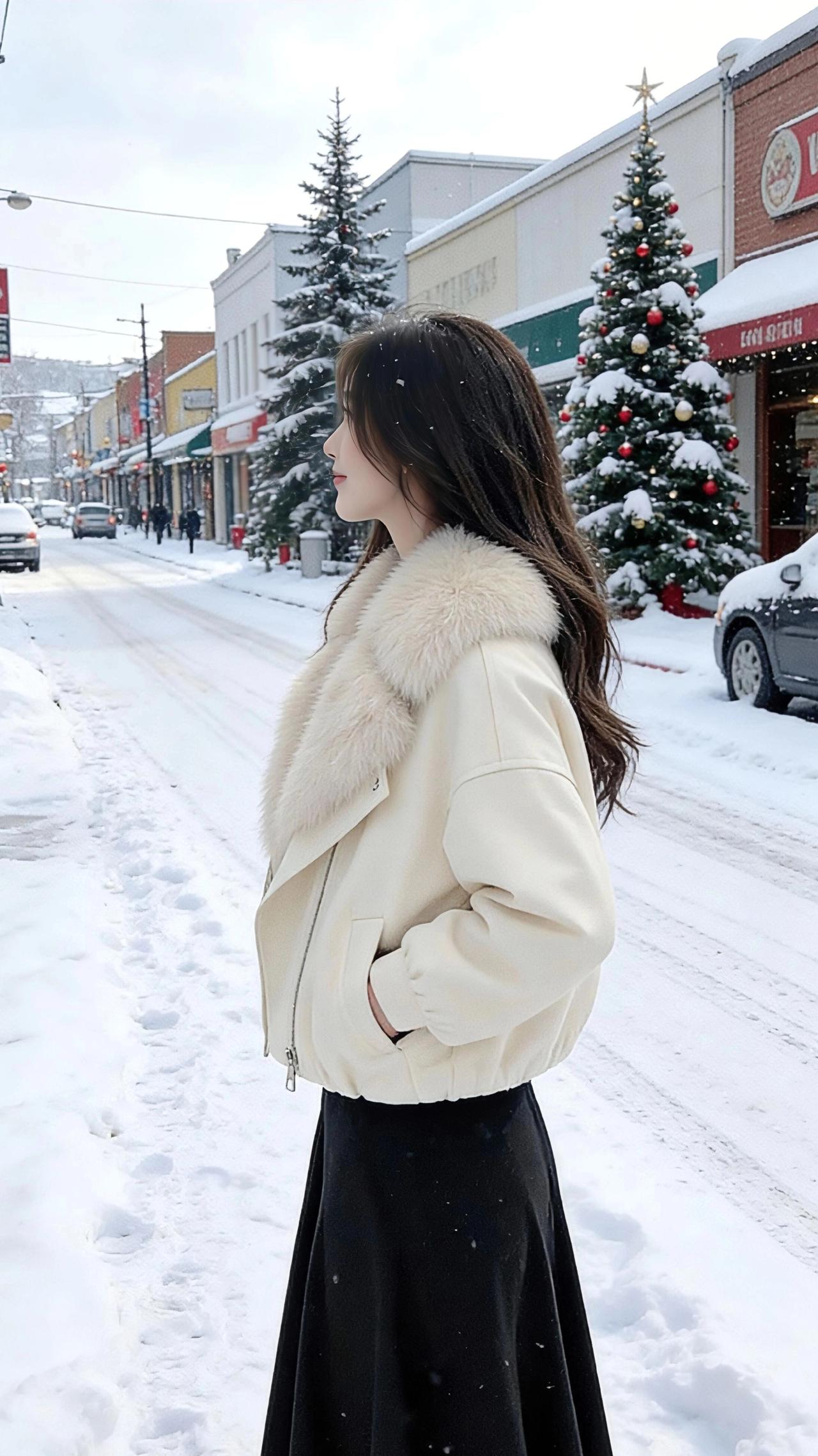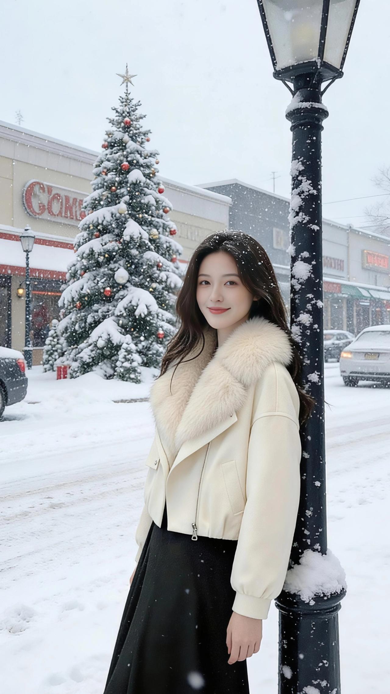 雪落圣诞街 雪是初冬最温柔的信笺,洋洋洒洒落在圣诞街的砖瓦与枝桠间。她站在落地窗前时,指尖轻抵冰凉的玻璃,窗外的圣诞树裹着银白绒毯,红珠与金球在雪雾里漾着暖融融的光,落雪的车辆静卧在街边,像被时光轻拥的玩偶。 推开门走进雪幕,碎雪便吻上发梢,她抬手拂去那点凉,指尖触到毛领的软,像触到一团化不开的云。路灯的光裹着雪粒漫下来,在她肩头揉出细碎的银,圣诞树的星芒遥遥晃着,与街旁橱窗的暖光缠在一起,织成一张温柔的网。 她沿着积雪的街道走,靴底碾过新雪的声响,是冬日里最清浅的歌。手插在衣兜时,便望向街道尽头的雪色,楼宇与树影都浸在牛乳般的天光里,孤寂像一缕薄烟,却又被周身的暖柔揉碎。雪还在落,落在圣诞街的每一处角落,也落在她眼底,凝成一汪纯净的湖,盛着冬日独有的、静谧又温柔的甜。 高级感穿搭 小个子穿搭 冬季穿搭