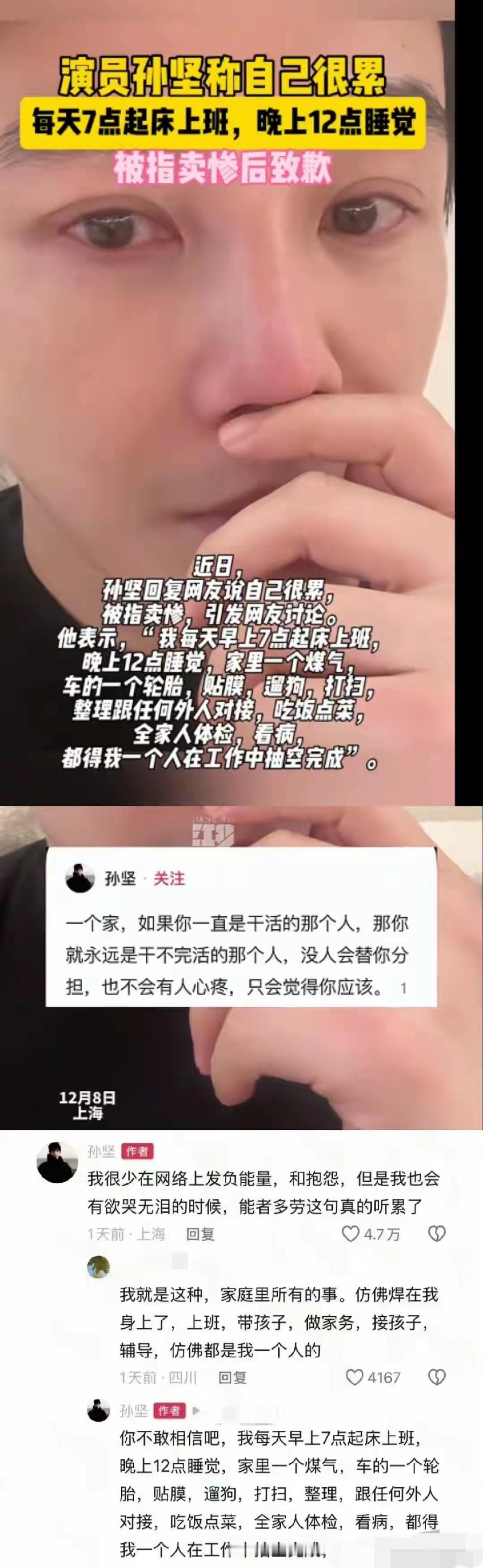 孙坚这次真有点“委屈”了!前两天发视频眼圈红红,说家里修煤气换车胎遛狗全自己扛,累到深夜还没人搭把手,结果被网友怼“卖惨”。熬了两天,他赶紧道歉:“没控制好情绪,忘了自己是公众人物!” 其实想想挺真实——明星也得通马桶换轮胎,和家人吵完架一样憋屈。只不过普通人发牢骚顶多被朋友吐槽,明星一说就被挂上热搜。孙坚最后倒挺实在:道歉归道歉,生活照分享,只是以后说话得多掂量。 这年头当明星也不易,哭笑都得算好分寸。下次他再吐槽家务事,估计得先默念三遍“谨言慎行”了吧!