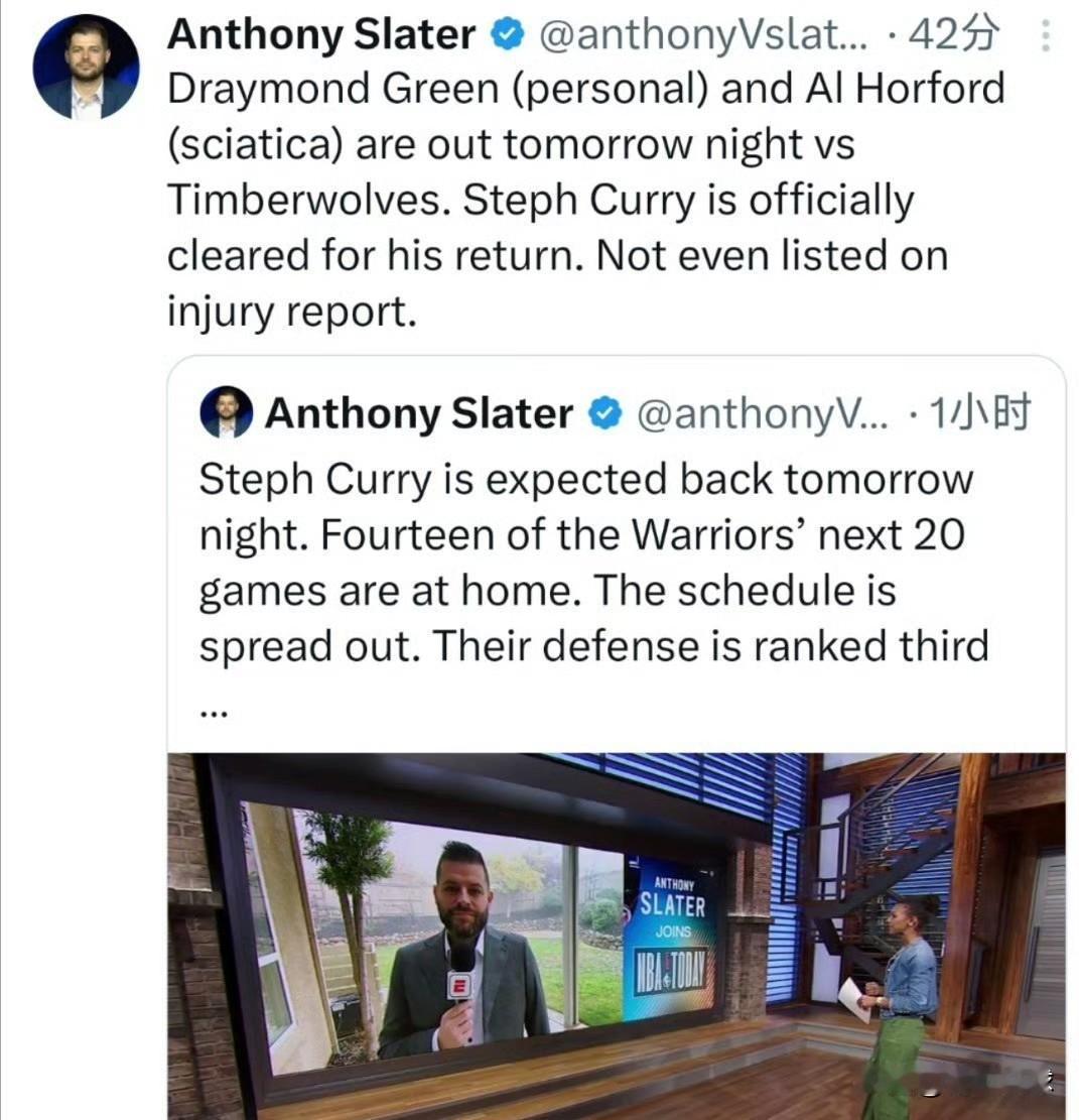 库里复出时间确定了! 据勇士队跟队记者Anthony Slater报道:库里将