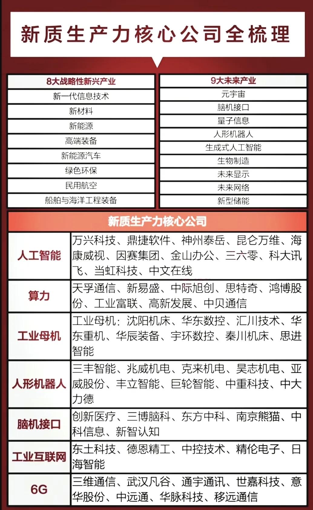 2025中央经济工作会议概念梳理! 中央经济工作会议12月10日至11日在北京举行。会议确定明年经济工作抓好以下重点任务坚持内需主导建设强大国内市场、加快新型能源体系建设扩大绿电应用、提高新质生产力加快高端制造等等。 从此中央经济工作会议利好板块有统一大市场概念、国内消费概念、新质生产力概念、反内卷概念等等。相关题材概念核心龙头代表有哪些? 统一大市场概念:小商品城 新质生产力概念:详细见配图 免税消费概念:中国中免 反内卷概念:福建水泥 理财有风险入市需谨慎,资料取材网络仅供参考不能作为投资依据。