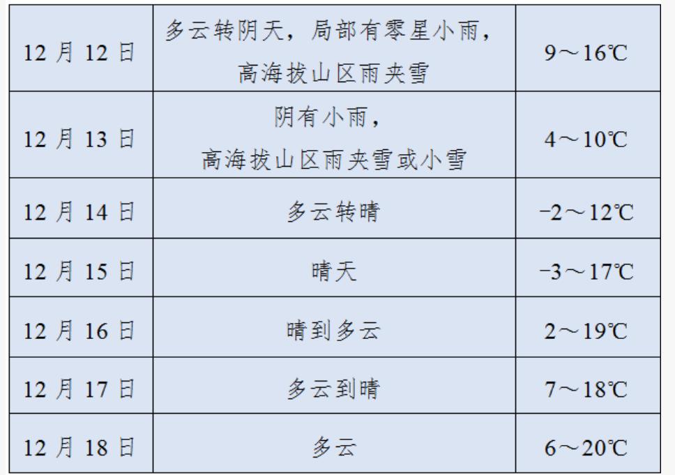 黄山市气象局最新消息,12月12-13日全市将有一次雨雪天气过程,其中12日夜里到13日白天高海拔山区有雨转雨夹雪或小雪;19-20日有小雨天气;其余时段全市以晴到多云天气为主。