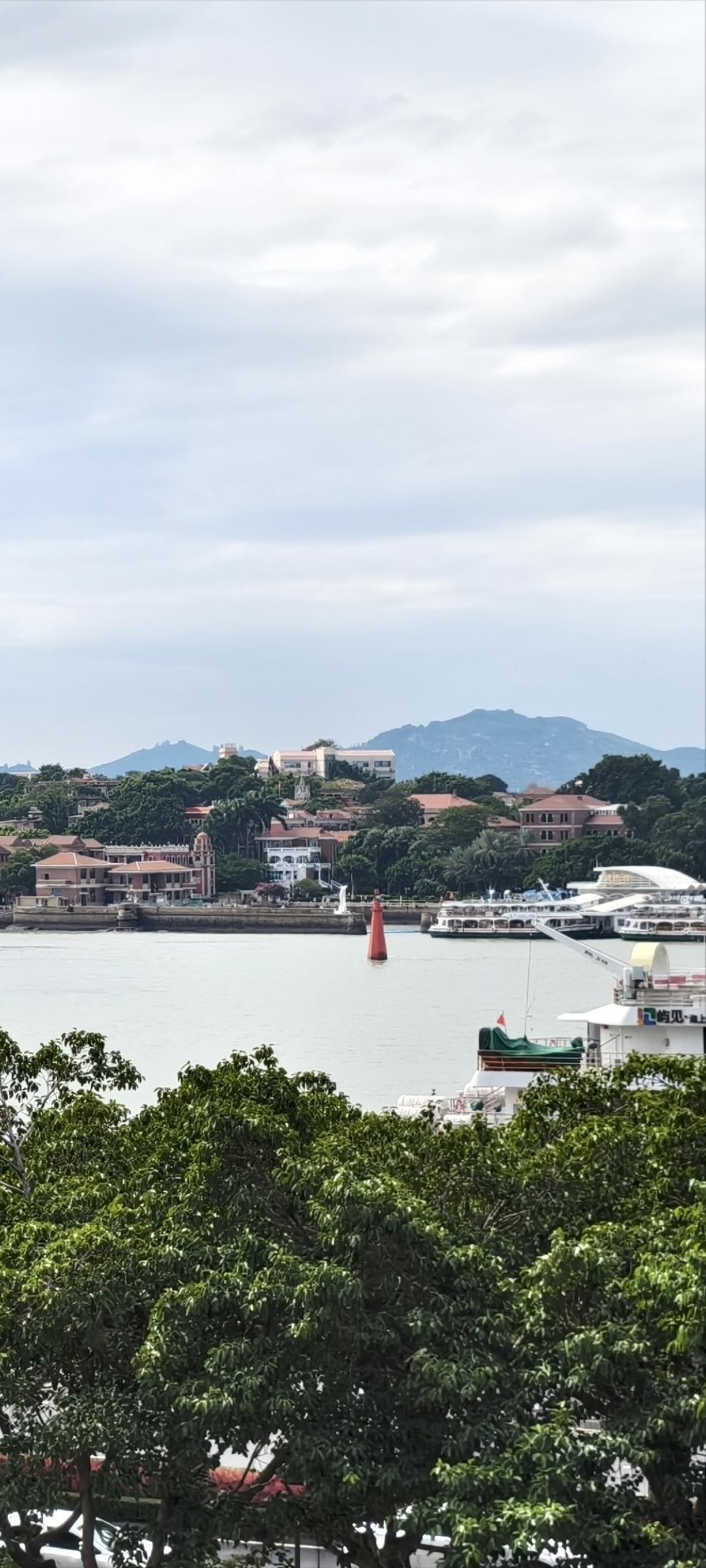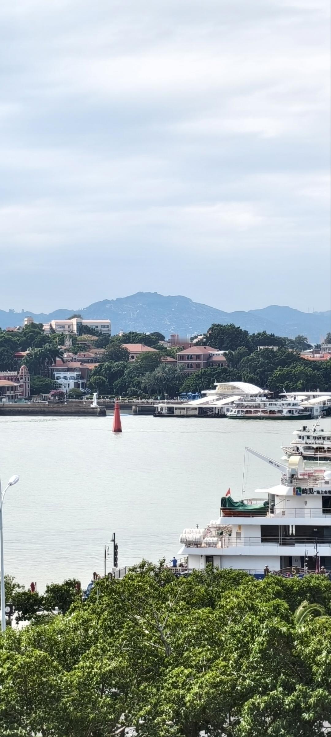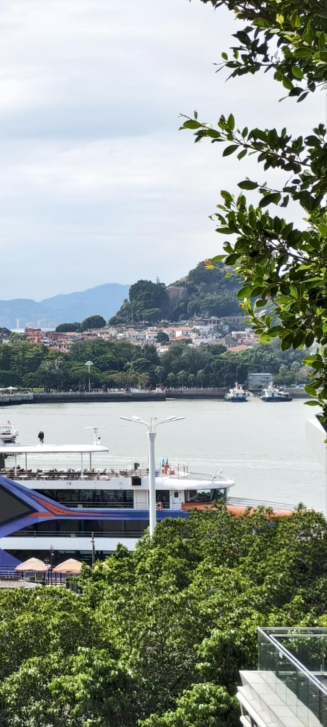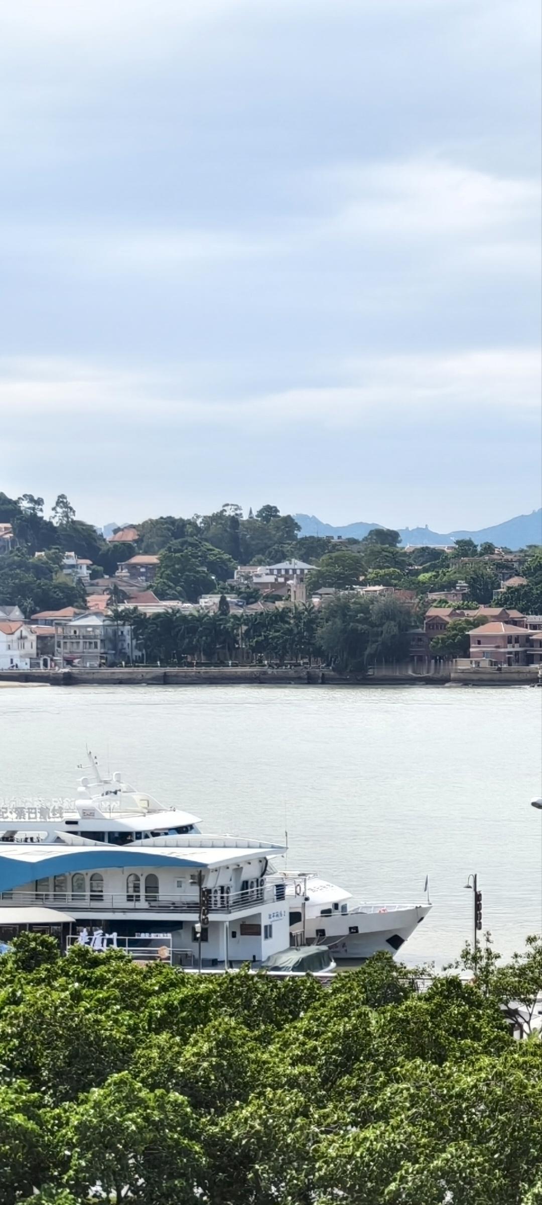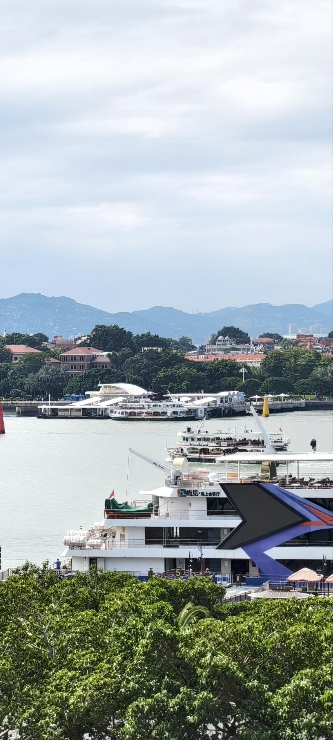 海港风光,游轮停泊,绿树掩映,宁静祥和。