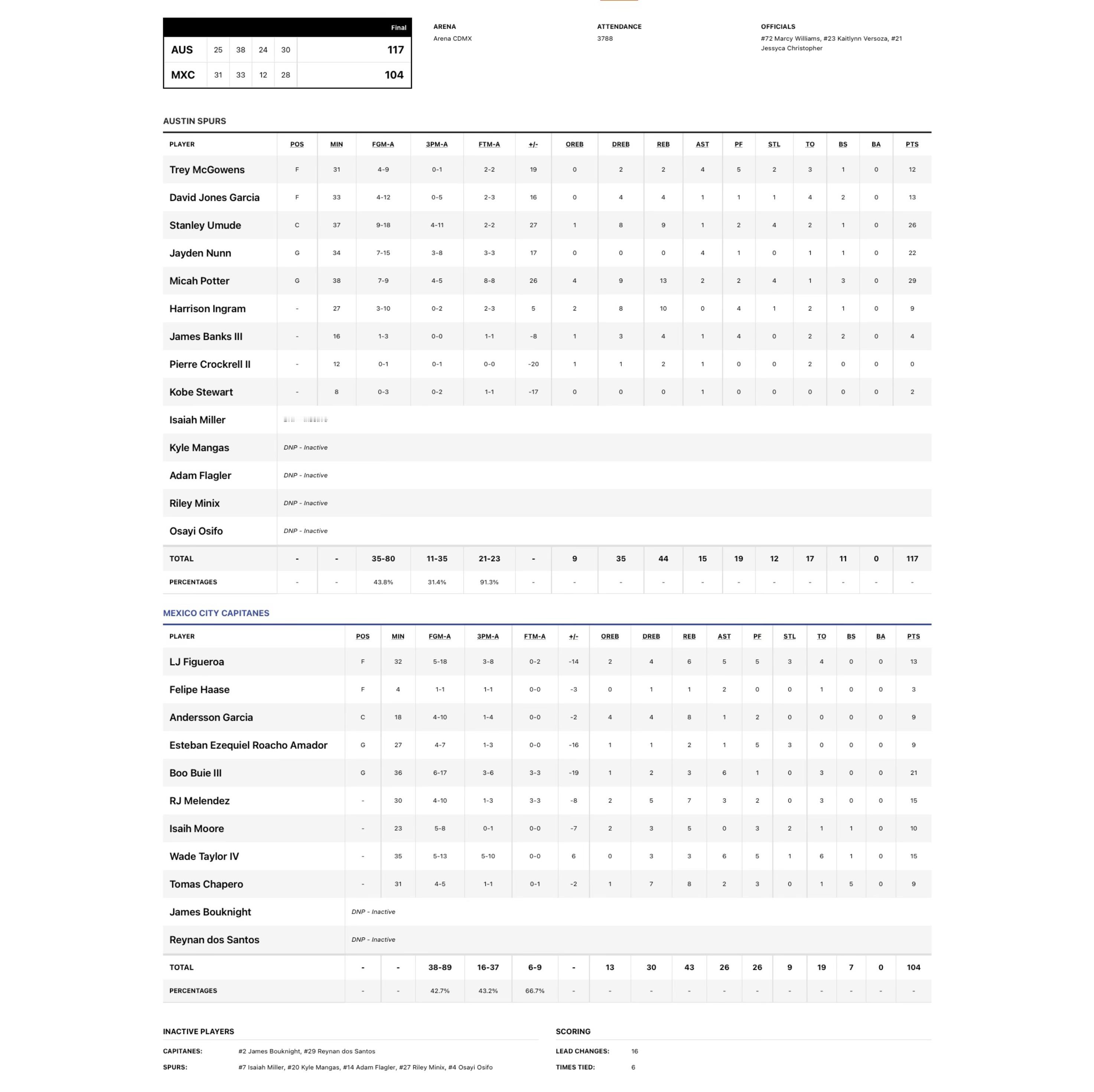 6连胜!战绩来到11胜1负!奥斯汀马刺107-104客场再胜墨西哥城船长队🎉奥斯汀马刺: 米卡-波特29分13篮板、加西亚13分4篮板、特雷-麦格文斯12分4助攻、乌姆德26分9篮板、纳恩22分4助攻墨西哥城: 菲格罗亚13分6篮板5助攻、布伊21分6助攻、梅伦德兹15分7篮板、摩尔10分5篮板奥斯汀马刺下一场将对阵得克萨斯传奇队超话创作官 |NBA发展联盟 |圣安东尼奥马刺