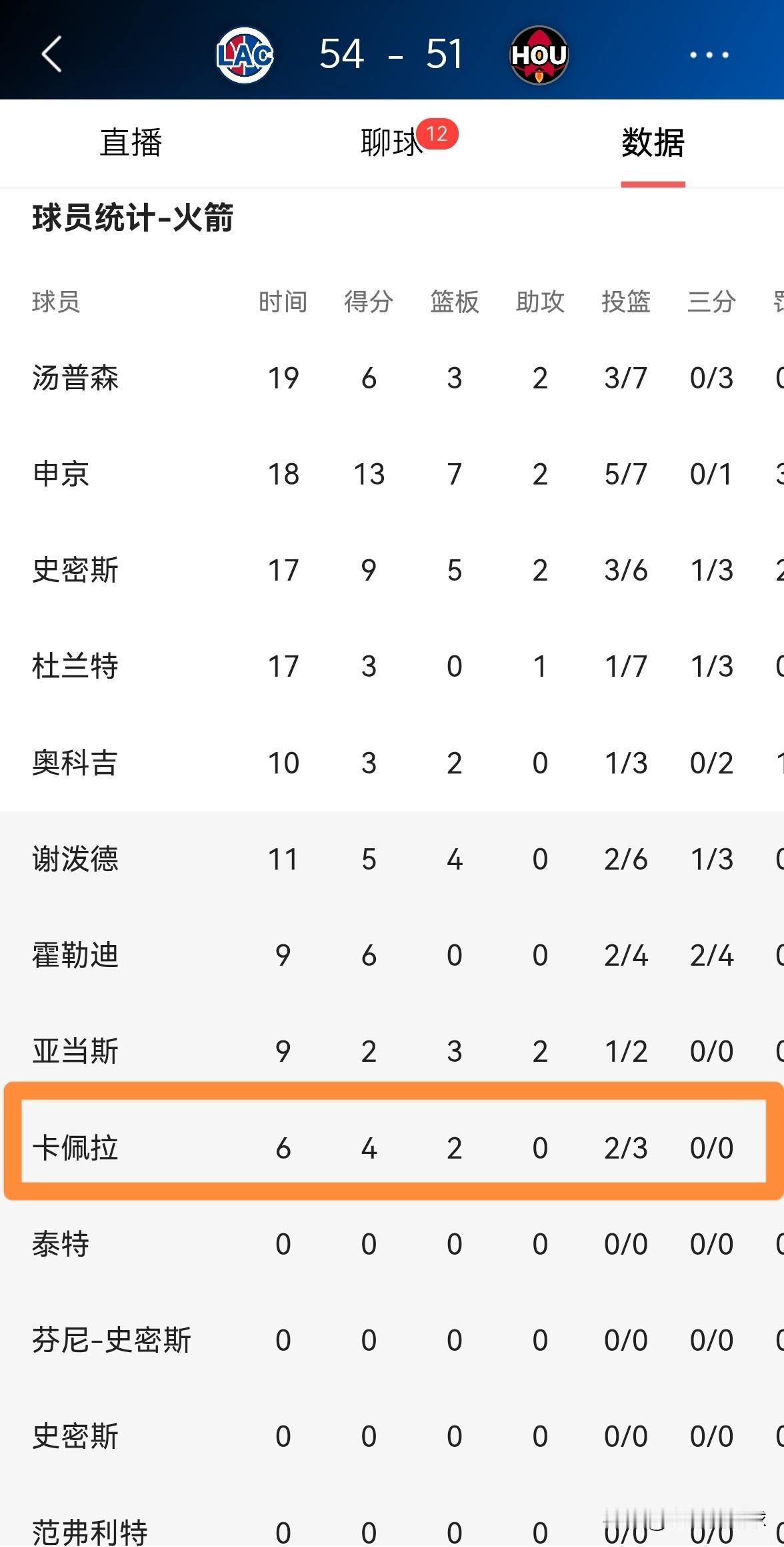 我强烈建议火箭主帅乌度卡增加卡佩拉的上场时间!在今天火箭主场迎战快船的比赛中,目前双方半场战罢,虽然火箭目前以51:54落后于对手,但是卡佩拉的表现却非常出色。 在前两节比赛中,卡佩拉替补出战6分钟,投篮3中2得到4分2篮板,他的场上正负值为+1。 实事求是的说,卡佩拉绝对配得上更多的上场时间,他的护筐能力确实非常出色。