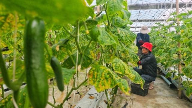 在金山区金山卫镇的上海农瑞生态农业发展有限公司的种植大棚里,翠绿多汁的水果黄瓜迎来丰收,12月10日上午,果农正在采摘上市。