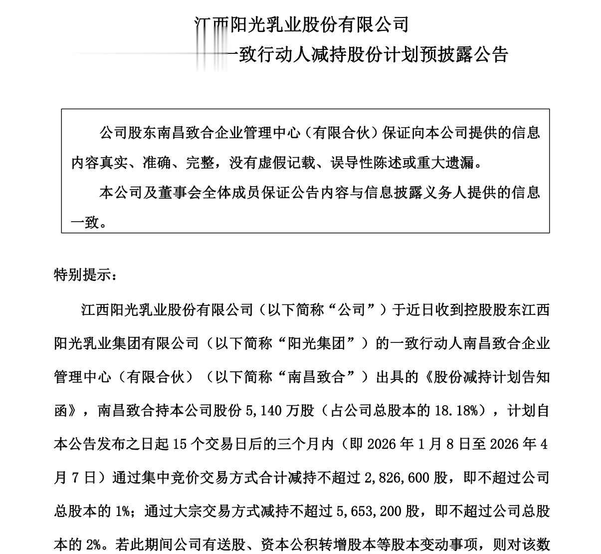 12月11日晚,阳光乳业公告,持有公司18.18%的控股股东阳光集团一致行动人南昌致合,计划于公告起15个交易日后的三个月内,分别通过竞价和大宗交易方式减持公司283万股和565万股。即合计减持848万股,占公司股本的3%。