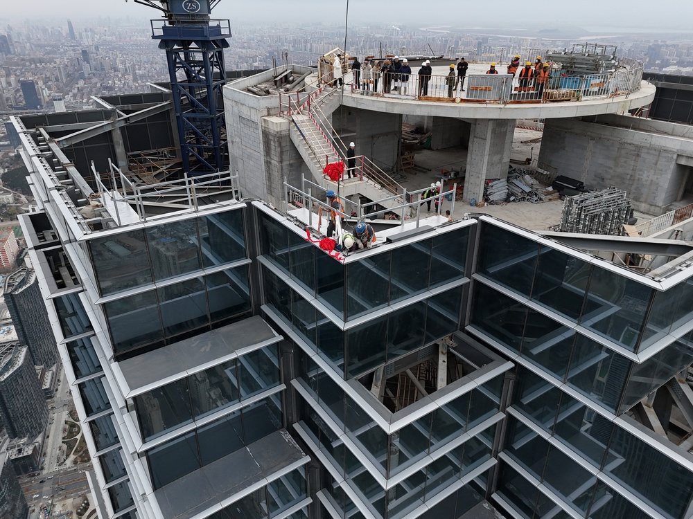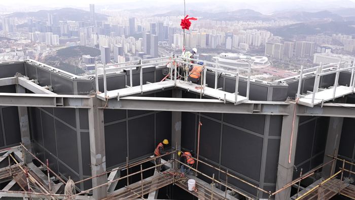 继塔冠幕墙全面封顶后,项目将全面转入内部机电、消防、电梯、精装施工新阶段。目前,项目主塔楼内机电、消防施工已完成总量的40%,正全力冲刺72层以下机电消防实物工程量、各分区精装样板层的施工目标。