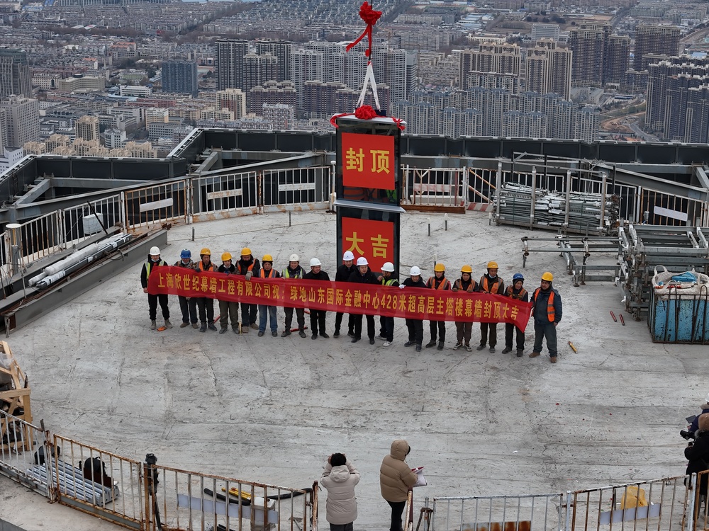 12月12日上午,在济南中央商务区“群峰之巅”,随着最后一块幕墙单元体的顺利吊装完成,绿地山东国际金融中心(IFC)428超高层项目塔冠幕墙正式封顶,项目整体形象全面成型,齐鲁天际线璀璨亮相,以“山”之势登峰齐鲁之巅,为泉城济南再添一张崭新城市名片。济南市历下区委书记杨传军,中央商务区管委会主任王海清,绿地山东区域管理总部常务副总经理刘茹涛出席仪式,并共同为最后一块幕墙单元体挂红,区住建局、管委会领导、部分媒体代表,428超高层项目参建各方代表60余人共同见证这一重要时刻。