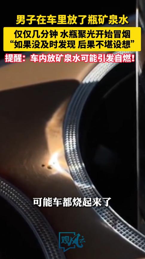 “悲剧还是发生了!”12月11日,四川,一男子在车里等人时,随手将矿泉水放在杯架里,结果几分钟后,他突然闻到一股烧焦味!查找后发现是杯架冒烟了,而这一切的罪魁祸首,竟是水瓶聚光导致的。网友:汽车自燃的原因找到了! 相信很多车主都会在车上放水,毕竟有时候需要跑长途,路上根本没有卖水的,不过这些水一定要放在太阳光照射不到的地方,不然很可能导致车辆起火。 当时天气不错,熊先生便打算和朋友一起出去玩,于是他开车过去接朋友,还贴心的准备了一瓶矿泉水。 只是没想到,就是这瓶水,差点让熊先生车毁人亡! 在车里坐了一会儿后,熊先生突然闻到一股异味,他好奇的寻找起来,发现杯架上冒出一抹白烟,定睛一看,杯架已经被高温烤穿了。 熊先生这才意识到,是矿泉水将阳光聚集到了一起,长时间的炙烤同一个位置,这才导致冒烟的,如果不是自己发现的及时,可能过一会儿车就烧起来了! 熊先生立马将矿泉水拿走,随后给杯架周围降了温,确保不会起火。 网友看后表示,很多东西都不能随意摆放在车里,比如水瓶、眼镜,它们都能够聚光,尤其是夏天的时候,短短几分钟的时间,就可能引发火灾! 信息来源:《男子在车里放矿泉水仅过几分钟水瓶聚光冒烟 当事人:“如果没及时发现后果不堪设想”》后浪视频