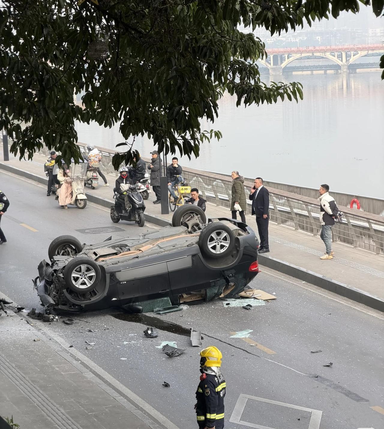 12月11日,四川德阳,旌湖国际酒店停车场附近发生一场比较诡异的车祸,疑是这台黑色宝马小车直接从停车场里面冲出来,就这么四脚朝天的砸在了停车场边上的马路上。三位美团小哥都不着急着送外卖了,还是看热闹要紧…… 关于这起车祸,网友把部分责任归咎于停车场的设置:停车场收费口设置在坡上,后面的围挡就几根不锈钢柱子加玻璃,有点不安全! 大家怎么看?