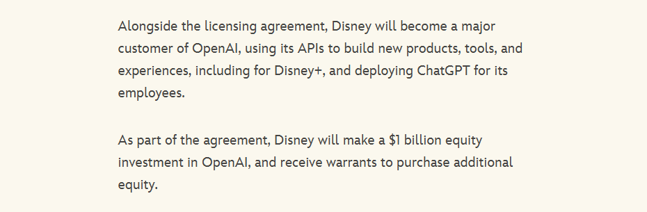 除内容授权外,双方还将在技术应用与商业合作上展开多维联动。迪士尼将成为OpenAI的主要客户,全面接入其API接口,为Disney+平台开发全新产品、工具与互动体验,同时在内部员工中部署ChatGPT,提升运营效率。值得注意的是,迪士尼在此次10亿美元股权投资基础上,还获得了额外股权的认购权,进一步深化了双方的资本联结。
