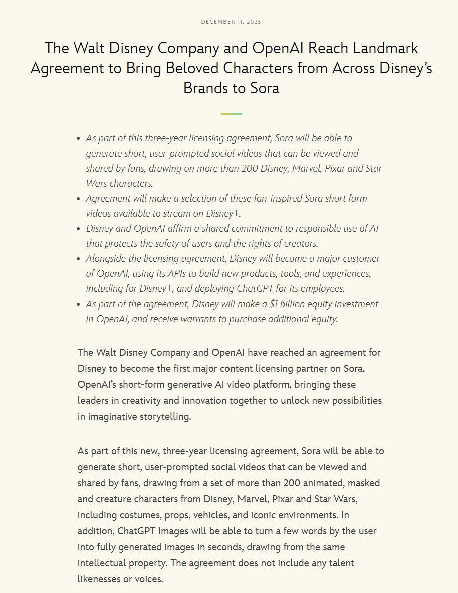目前,该合作协议仍需完成最终谈判、公司及董事会批准,并满足惯常结算条件,后续进展将由双方适时公布。业内分析认为,迪士尼与OpenAI的此次联手,不仅为生成式AI在娱乐领域的应用树立了合规标杆,也可能重塑用户与IP内容的互动模式——未来,粉丝不再仅是内容的消费者,更能通过AI工具成为“参与式创作者”,为全球娱乐产业的发展注入新动能。