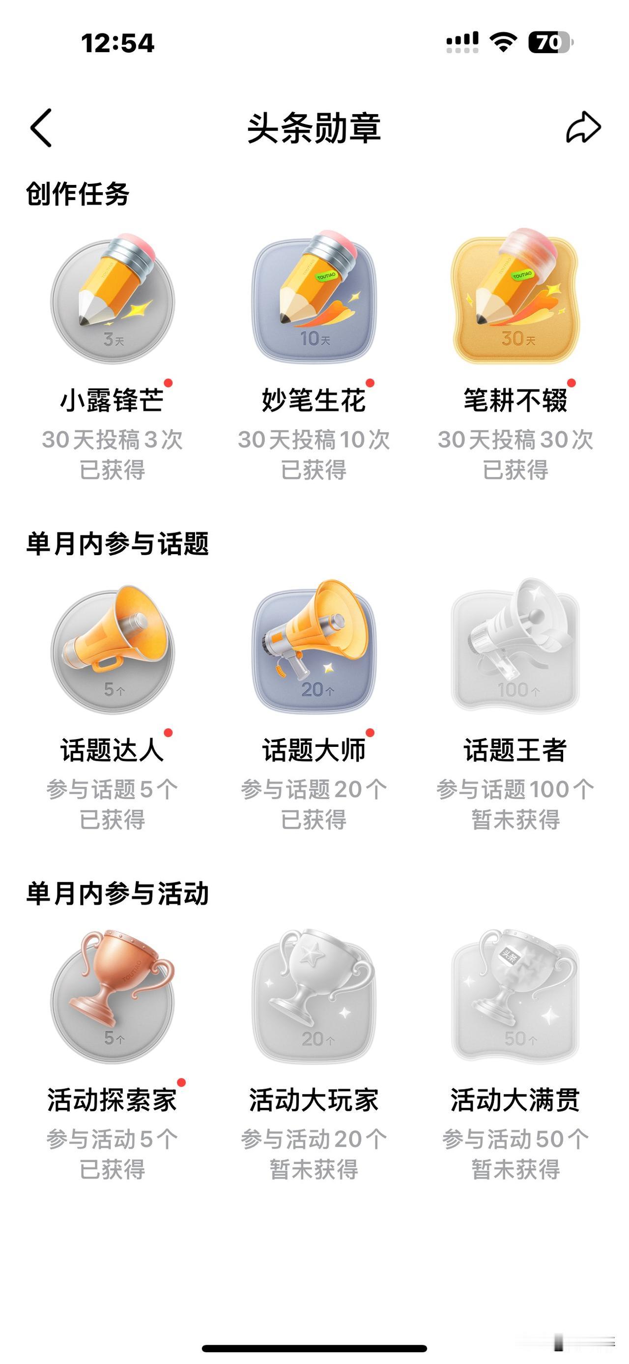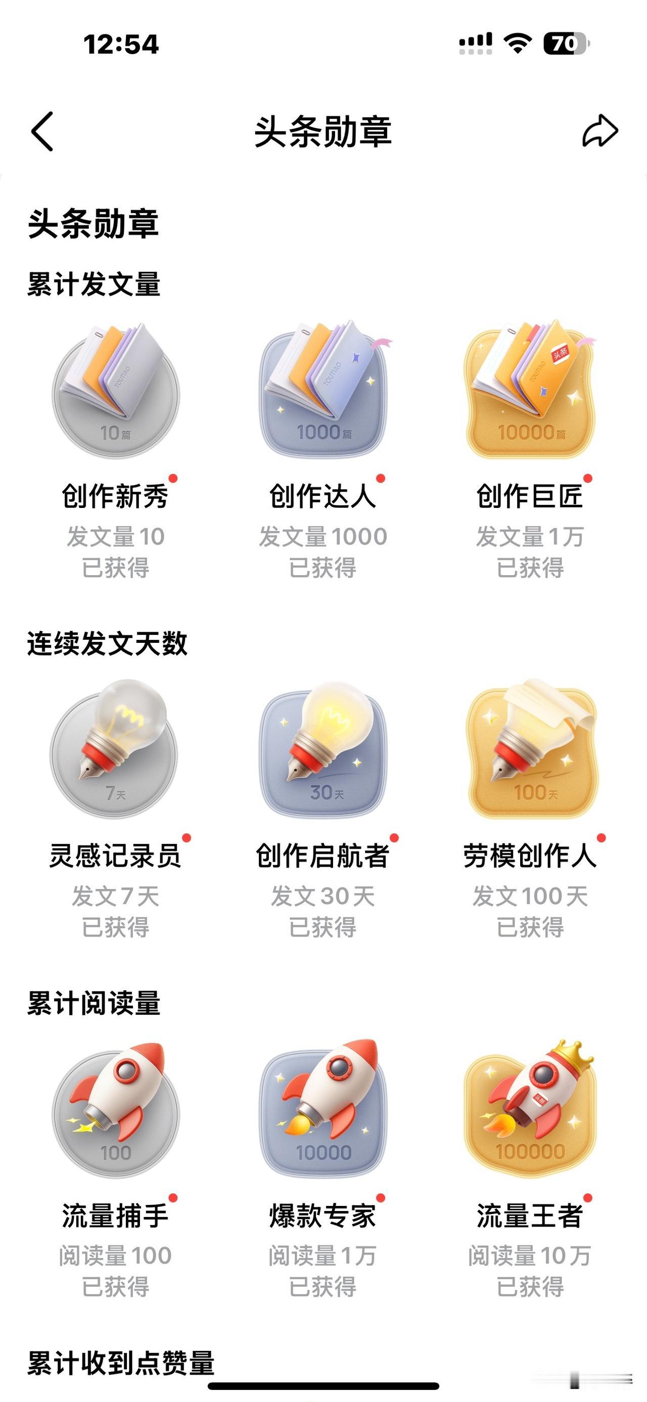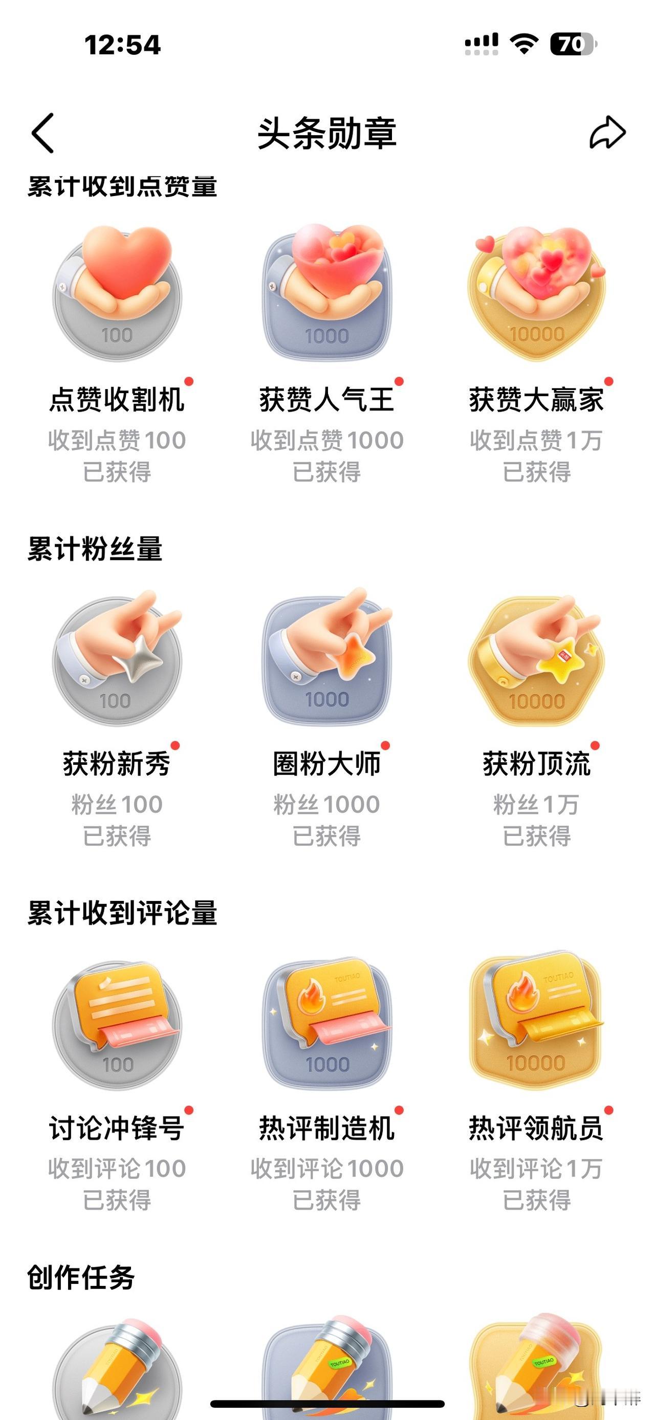 我荣获了24枚勋章! 最让我倍感自豪的当属“爆款专家”和“劳模创作人”这两枚勋章。 入驻头条5年,我创作的爆文(千万以上)少说也有几十篇,累计发文一万余篇。这两枚勋章的重量,不仅是对我创作成就的认可,更是激励我不断前行的动力。 我会争取在最短的时间内将其余三枚勋章全部收入囊中,届时实现头条勋章“大满贯”!