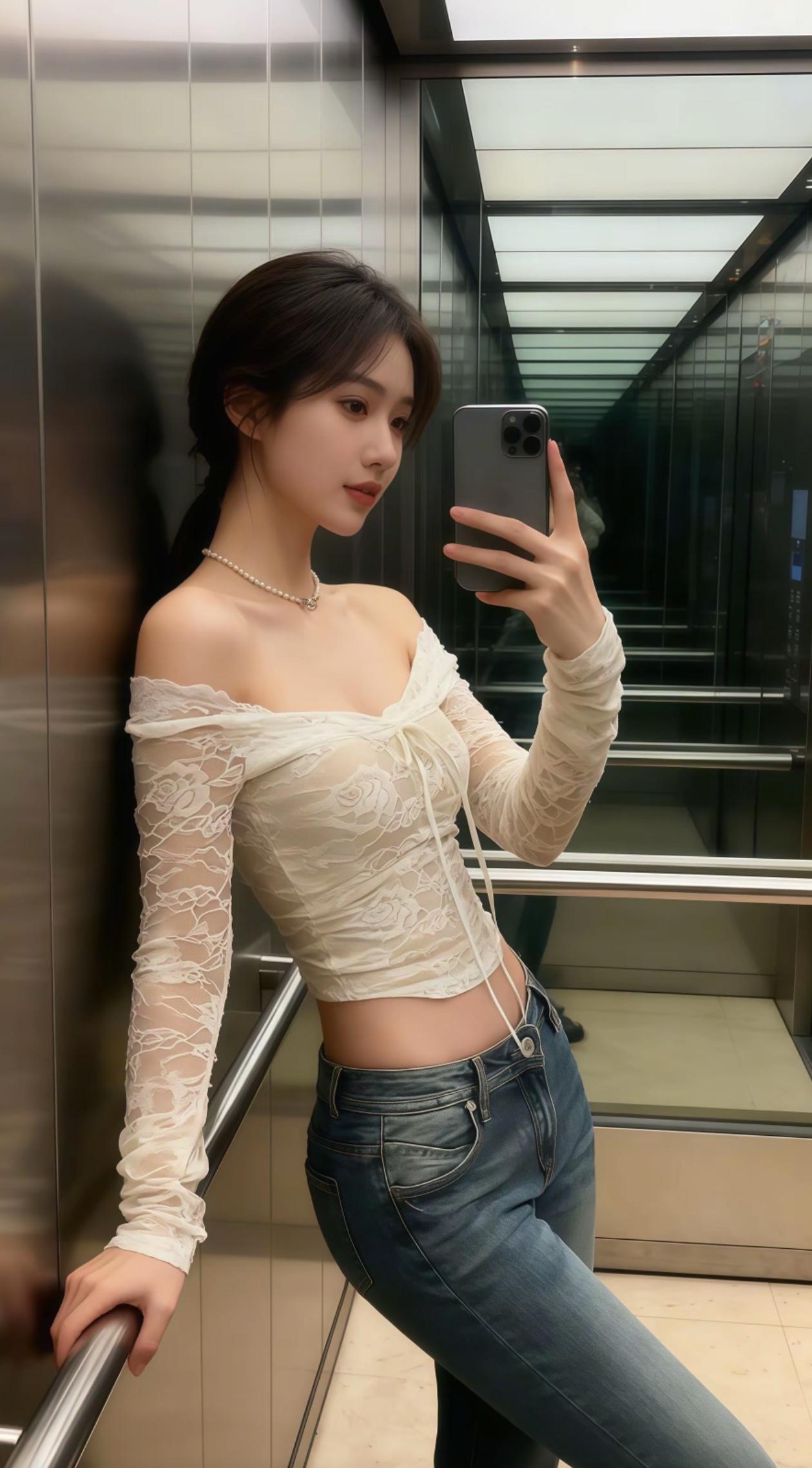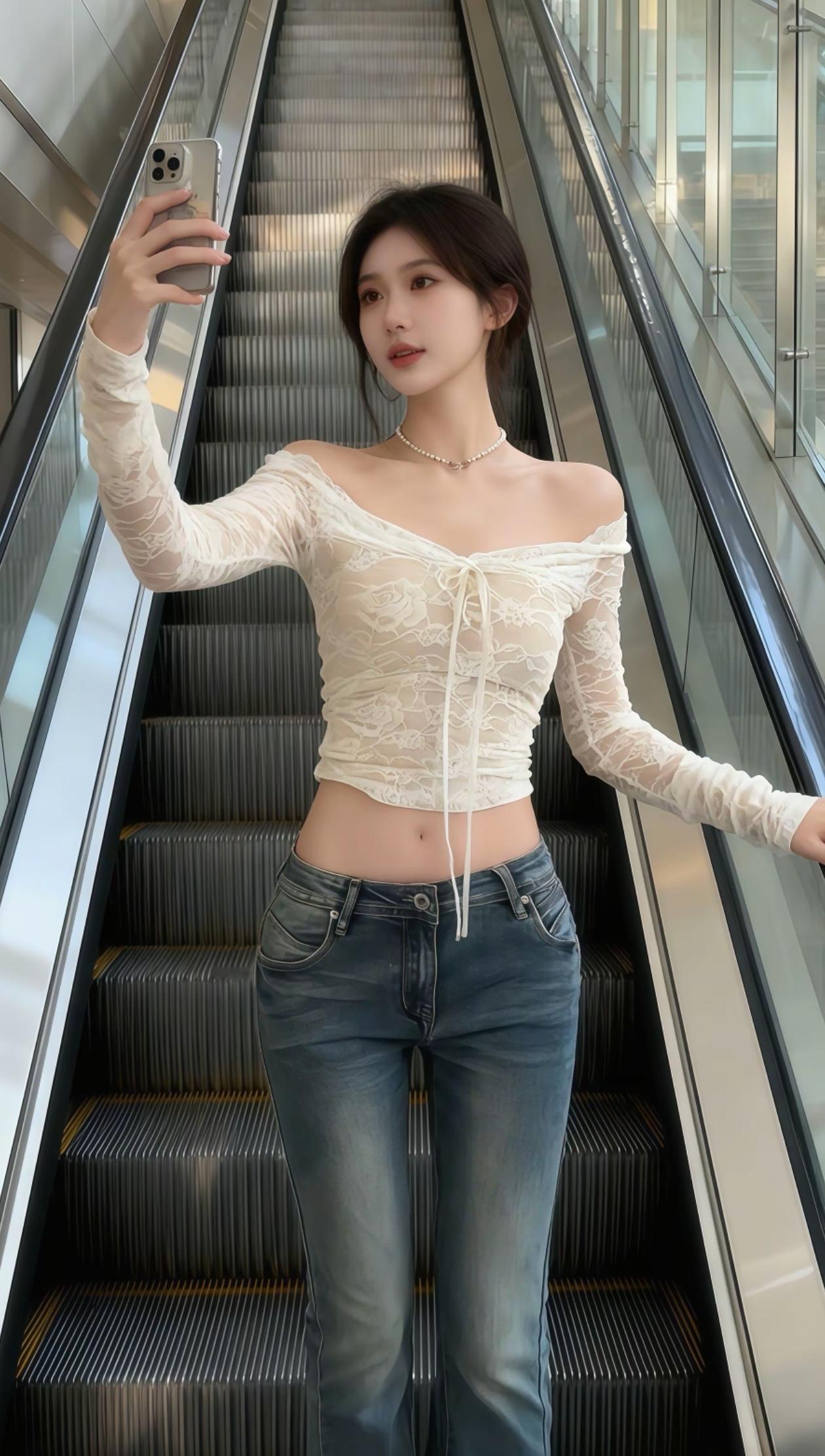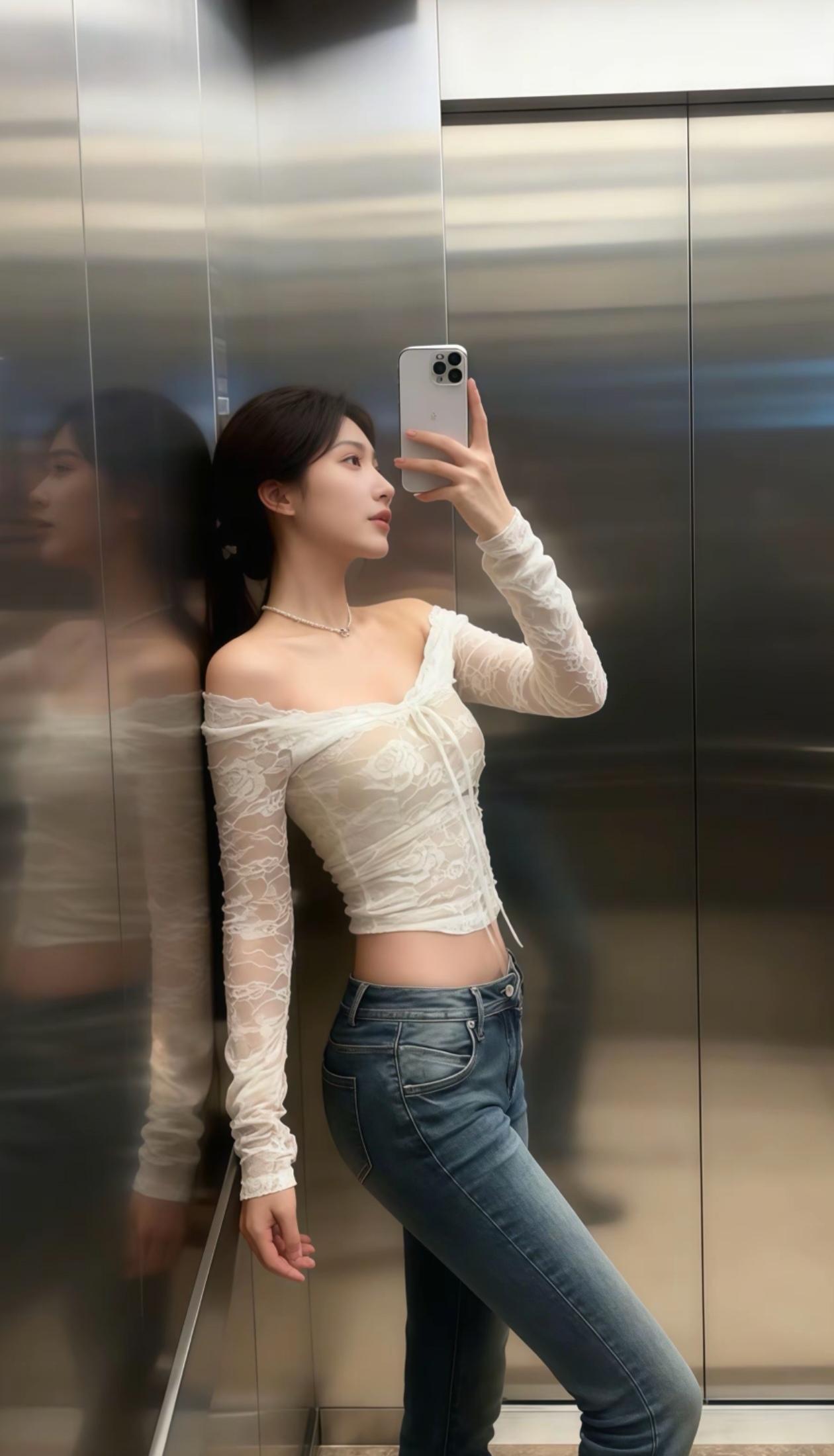 蕾丝上衣,和牛仔裤,尽显女性曼妙身姿