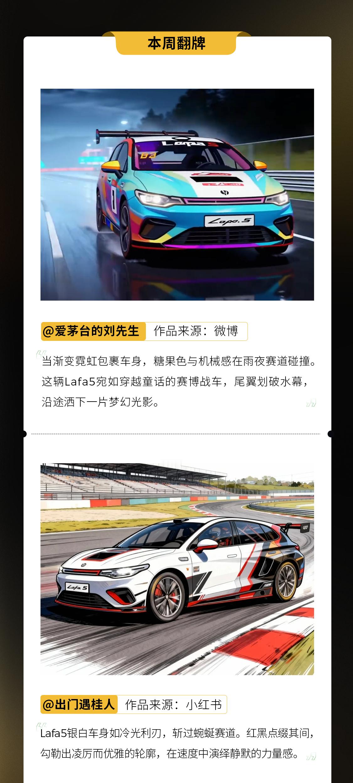 零跑Lafa5百万共创计划|第四周翻牌奖惊喜揭晓!恭喜本周两位创作者,用各自灵感诠释了他们心中的Lafa5各获得100元京东卡奖励!🎉🚗Lafa5化身赛博战车,在赛道中绽放梦幻光影⚡️银白车身红黑点缀,在速度中静默释放力量感每一份创作,都是对Lafa5的独特诠释你的灵感,也可以被“翻牌”!参与方式超简单📍时间:即日起-2026年3月31日24:00📍平台:微博/零跑APP/小红书📍带话题:每个人都可以有自己的Lafa5零跑Lafa5 发布你的原创图文/视频硬核派/生活派/创意派 三大赛道任你发挥,500万共创支持金持续助力!快来与我们分享你心中的Lafa5吧,下一周,期待你的作品上榜!✨年轻人首选Lafa5限时9.28万起