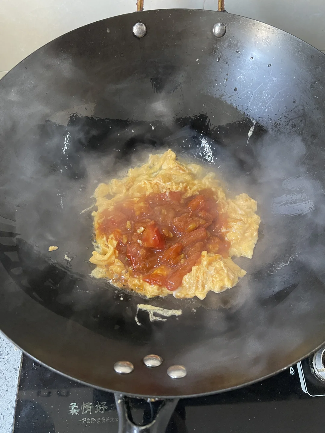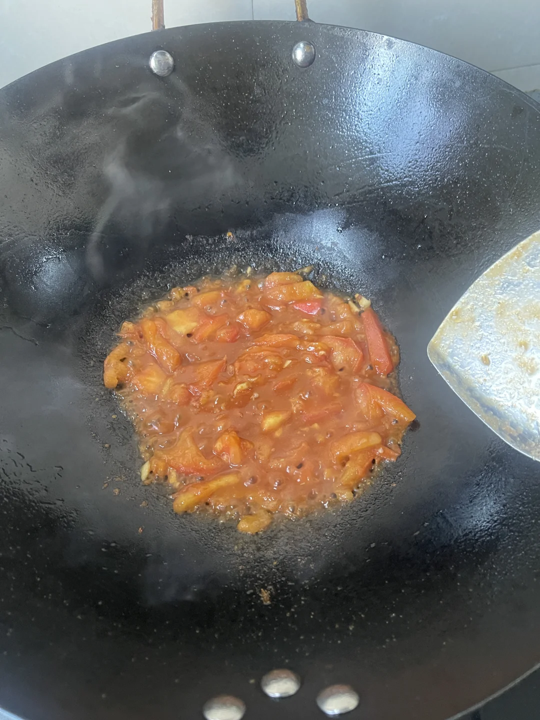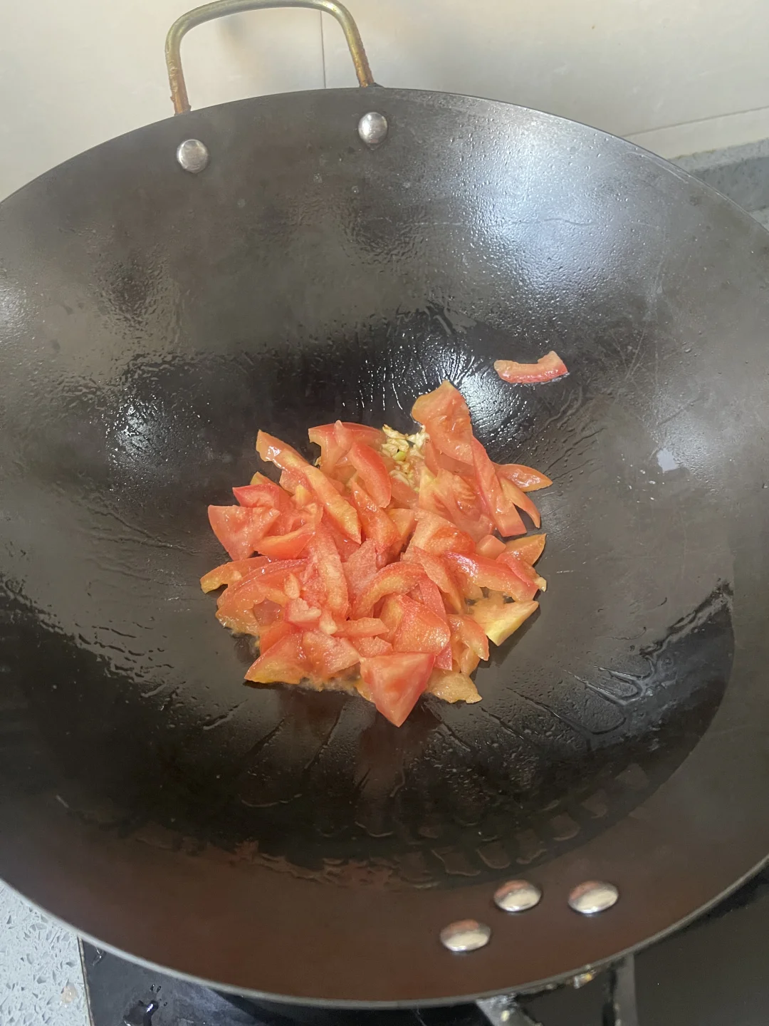 锅内热油下蒜粒爆香下入番茄炒至出沙