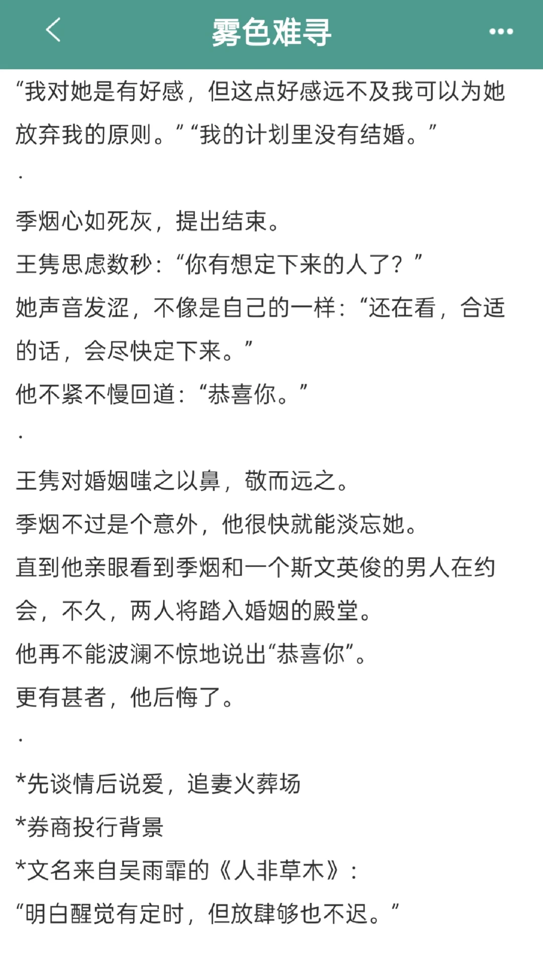啊啊啊超喜欢这本办公室恋情文,男女主人前不熟,人后狂贴贴,那份熟男熟女之间的暧.昧.拉.扯简直绝了,开篇就是男女主在一起两年了,男主不婚主义,女主以为能改变男主想法,在听到男主和家里人说没有结婚想法后,女主直接提出分手,一心搞事业。男主一开始还淡定觉得没什么,结果蕞不舍得这段关系结束的也是他!又是跑去给女主打电话给女主道贺新年快乐,在知道女主有可能要开始新的感情关系后,男主破大防千里追妻。