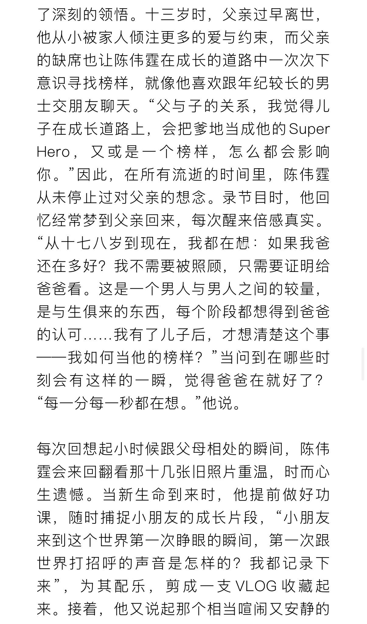 陈伟霆首谈官宣生子原因 被陈伟霆这圈粉了!官宣生子是低调筹备多年的决定,是想让孩子知道,他的到来全是爱与祝福。童年的遗憾让他更重视父爱,这份温柔与担当太暖了!