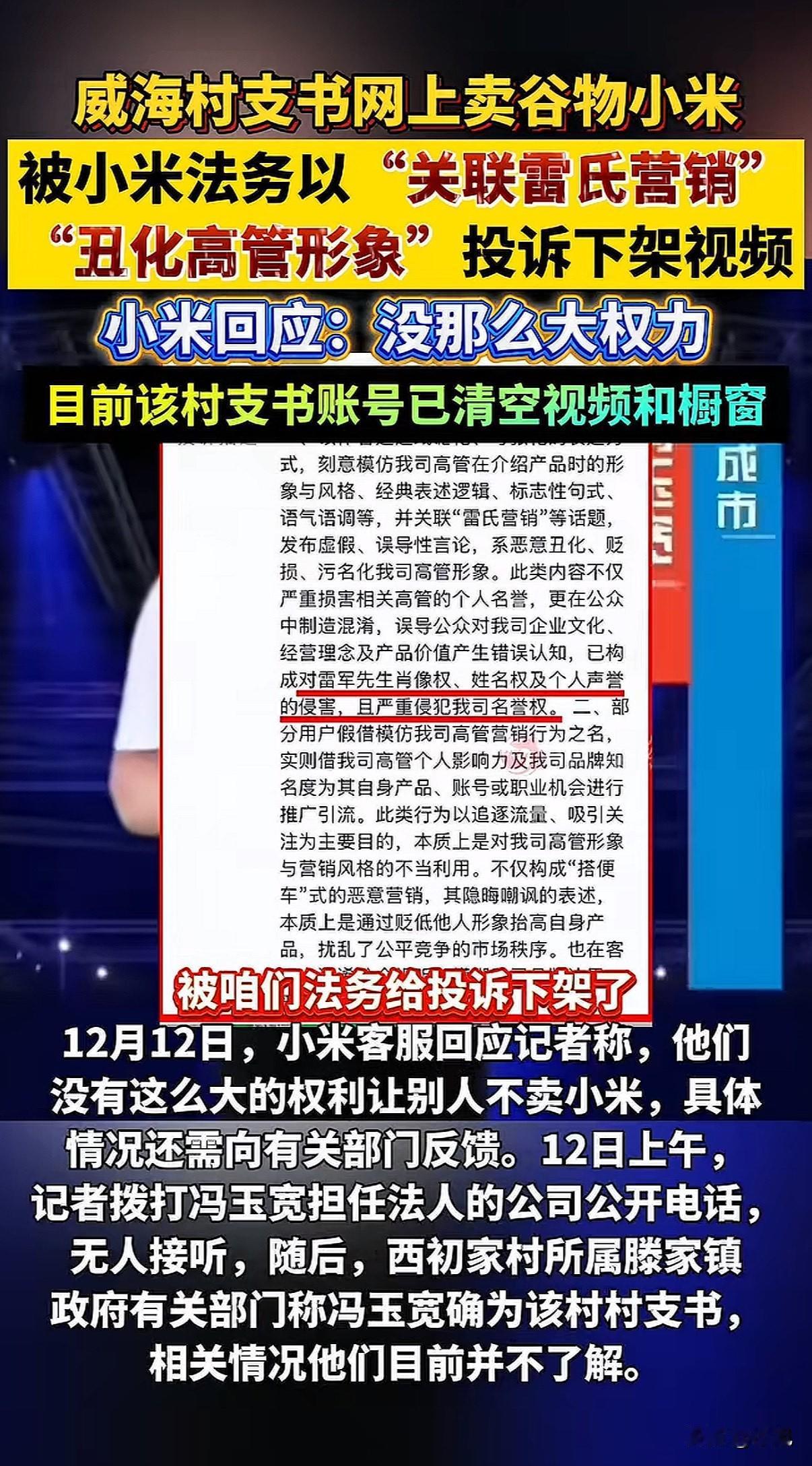 村支书卖自家小米,被小米公司投诉了。他对着镜头说:“如果连‘小米’这两个字都不让用,想知道我们还能做点什么。”这句话听起来特别心酸,但事情的真相,远不止一句话那么简单。 这位山东威海的村支书冯玉宽,在网上卖农产品。他的卖法,和所有农民都不一样。他拍了个视频,叫“金谷小米发布会”。场景布置、演讲台、甚至他的西装和手势,都在像素级复刻小米科技发布会,模仿雷军的样子。 他学着雷军的口吻说:“尊贵的品鉴官们,时光不负有心人。”更夸张的是,他给自家谷物小米编造了一堆像科技产品一样的数据,比如“提升多巴胺分泌63%”、“改善下颌线”。视频里甚至还穿插了一个画面:小米的SU7汽车,被“黑白无常”追赶。最后,他来了句:“雷总,对不起。” 明眼人都能看出来,这是在蹭流量,而且是高强度的关联营销。所以小米法务投诉了他,理由是“关联雷氏营销”、“丑化形象”。问题的核心,是他这种模仿和编排的营销方式,而不是“小米”这个农产品名字。 但这位村支书的回应,非常巧妙。在他后续发布的视频里,他对模仿和编排只字不提。他紧紧抓住“小米”两个字,对着公众诉苦:我们农民卖点粮食不容易,如果连“小米”都不能叫,我们还有啥活路?一下子,就把一场可能涉及侵权的商业营销争议,扭转成了“大企业欺负小农民”的悲情故事。 舆论第一波,很多人支持他。觉得助农创新不容易,大公司应该包容。农民用“小米”这个名字天经地义。 但很快,视频评论区出现了反转。有眼尖的网友发现,这位诉说农民不易的村支书,腰上系的是一条GUCCI腰带,市场价大概五千块。身上穿的是一件盟可睐的羽绒服,大概一万二。还有信息显示,他名下关联着一家建筑公司。 一身奢侈品,开公司,却用最朴素的“农民”身份来呼吁同情。这个形象反差太大了。很多人开始回过味来:他的视频封面刻意使用小米元素,标题紧紧捆绑“雷军”、“发布会”这些流量词。这不像是在单纯卖粮,更像是一场精心策划的“碰瓷式”营销。 小米客服后来的回应也很明确:“我们没有这么大的权力让别人不卖小米。”人家从来没说不让卖粮食,投诉的是那种容易引人混淆、可能贬低品牌的模仿行为。法律上也支持,农产品叫“小米”是正当使用。 这件事就像一场舆论的“魔术”。村支书用一句悲情提问,轻轻遮住了自己模仿营销的核心事实,成功点燃了公众情绪。直到人们拨开迷雾,看清了操盘手本身的实力与装扮,才察觉味道变了。 助农需要创新,但创新要有边界。消费者的善意,是支持实实在在的农产品,而不是成为一场精心设计的流量游戏里的道具。这件事里,谁在真心卖小米,谁在巧妙秀操作,其实已经很清楚。