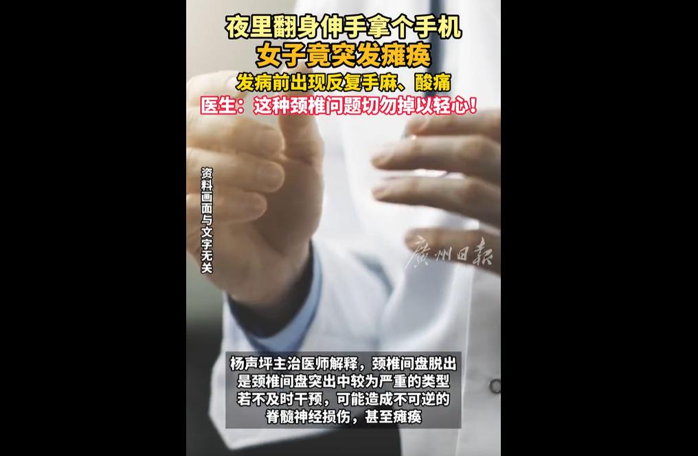 泉州 50 多岁的王女士手麻酸痛得受不了才去医院,泉州市正骨医院一查,颈椎间盘已经 “巨大脱出”,明摆着得赶紧手术,可她总觉得 “开刀吓人”,非要选保守治疗。 结果会诊当晚,她就翻个身伸手拿手机,双手突然动不了 —— 确诊瘫痪,关键肌肌力只剩 1 级或 0 级。 医生说,这种严重的颈椎问题拖不得,再晚连恢复的机会都没了,真不是吓唬人。 都查出椎间盘 “脱出” 到要压迫神经了,还把手术当 “洪水猛兽”,觉得 “忍忍就能好”,这不是跟自己的脖子过不去吗? 拿手机的小动作都能直接瘫了,早知道这样,当初还不如咬咬牙上手术台,总比现在手不能动强吧! 有些医生呢,喜欢沟通的‘专业废话’”:光说 “符合手术指征” 有啥用? 不会跟大妈说 “你这情况就像脖子里卡了块石头,再不取出来随时压坏神经,到时候手都动不了”? 非要讲术语,人家听不懂,能不害怕吗?沟通不到位,再好的建议也白搭! 再说 “日常习惯的‘隐形杀手’”:都颈椎出问题了,拿手机还不注意姿势,翻身都不知道慢点儿,这不是给病变 “递刀子” 吗? 平时总觉得 “小毛病没事”,结果一个不小心就成了大麻烦,真该好好反省下自己的生活习惯! 现在都 2025 年了,还觉得 “手术就是伤身体”,不知道很多手术早就是微创,恢复快得很。 非要抱着老观念硬扛,扛到瘫痪才后悔,这不是自找罪受吗? 健康这事儿,可别拿 “怕不怕” 当标准,得听医生的专业建议!