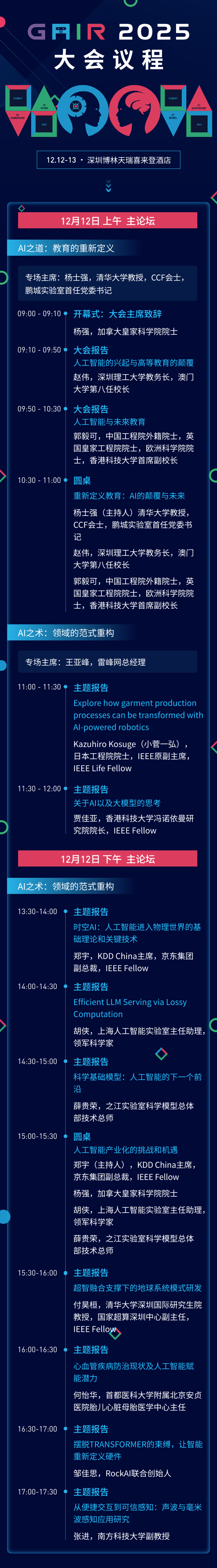 首日主论坛延续GAIR一贯的学术前沿特色,设有:“AI之道:教育的重新定义”、“AI之术:领域的范式重构”两大研讨主题。
