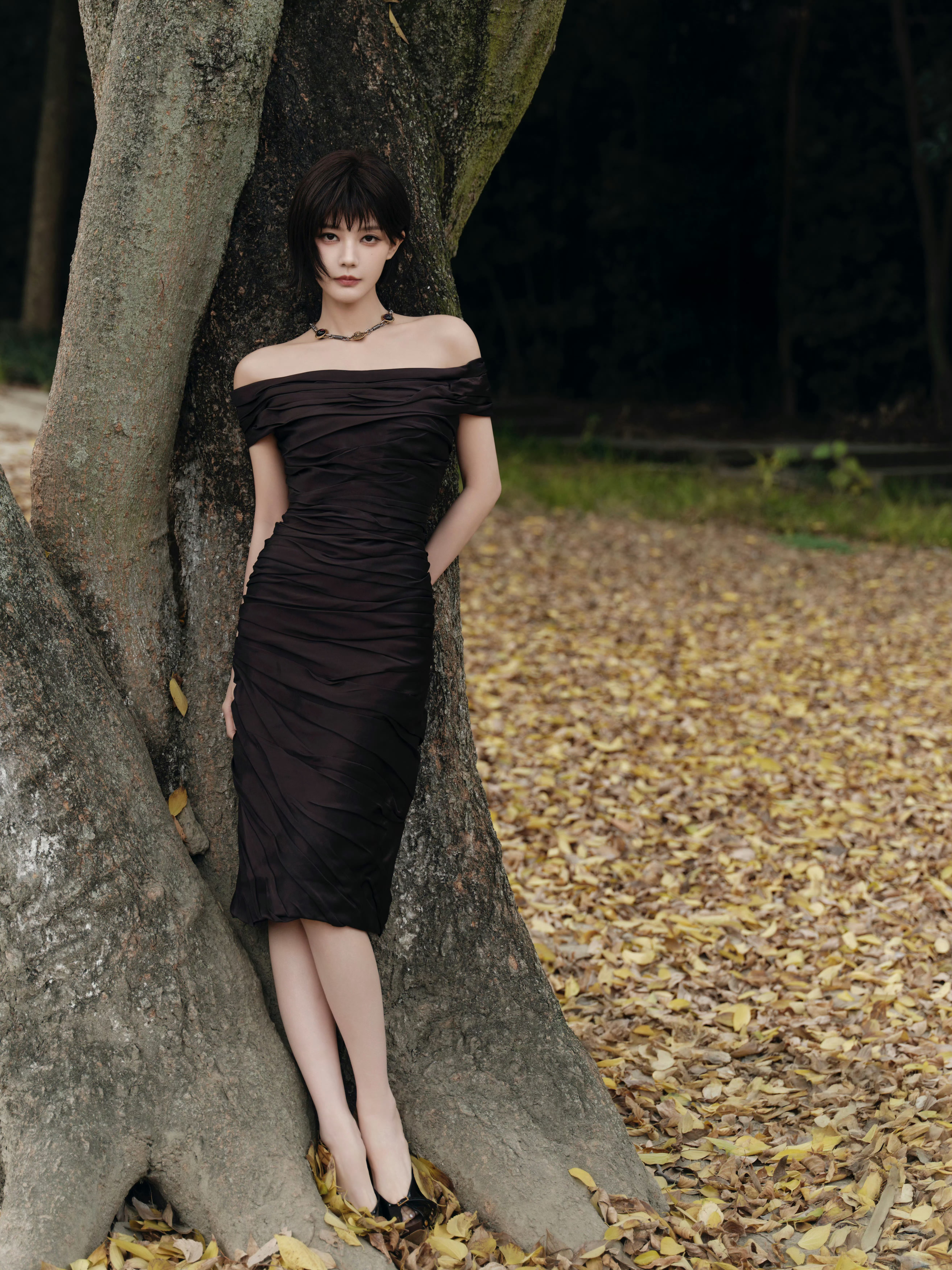 唐艺昕紫色眼妆挂脖深亮片长裙