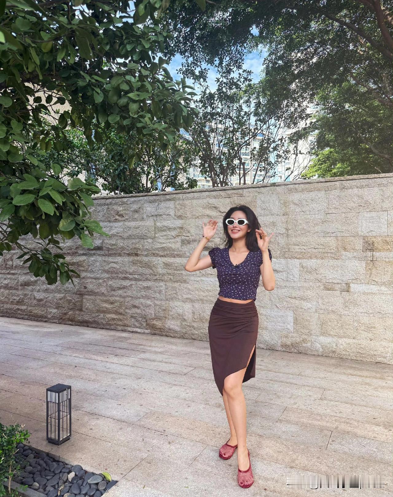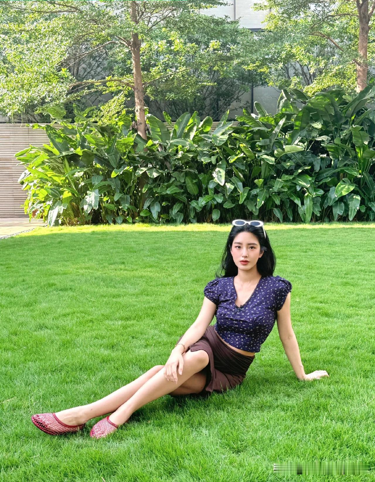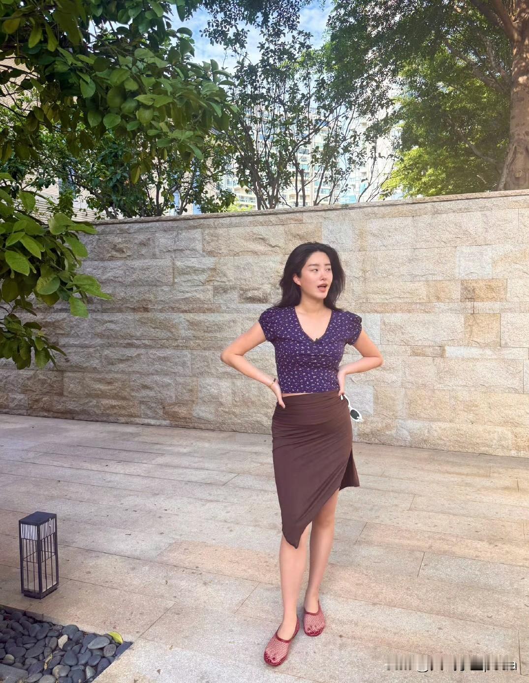 杨采钰这状态真是绝了! 整个人都在发光的那种健康美,一看就是气血超足,皮肤透亮。 碎花蓝T配棕裙也太会搭了吧,清新里带点复古味,棕裙子把身材曲线衬得刚好。 这一头波浪卷更是灵魂,慵懒又妩媚,走起路来肯定风情万种。 真是从气色到穿搭都挑不出毛病,妥妥的“活得很滋润”的大美女氛围!