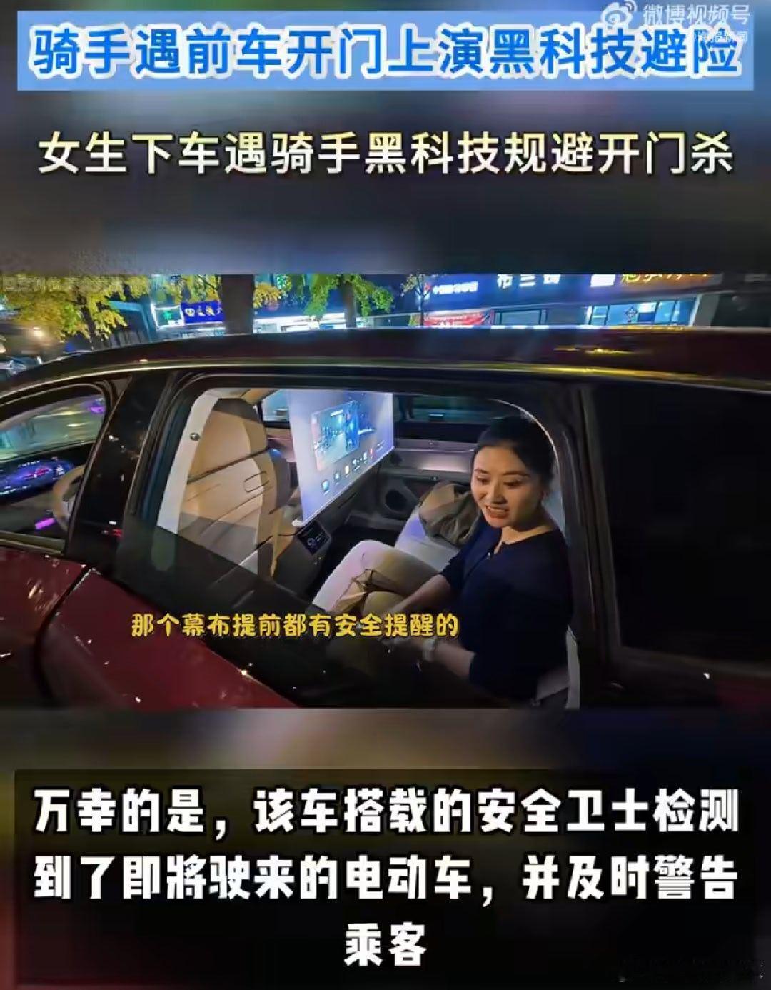 骑手遇前车开门上演黑科技避险 现在的开门杀真的太多了,特别外卖小哥在路上跑也挺不安全的,看车企有这些黑科技可以避免很多事故,安全卫士守护大家安全!女生下车遇骑手黑科技规避开门杀