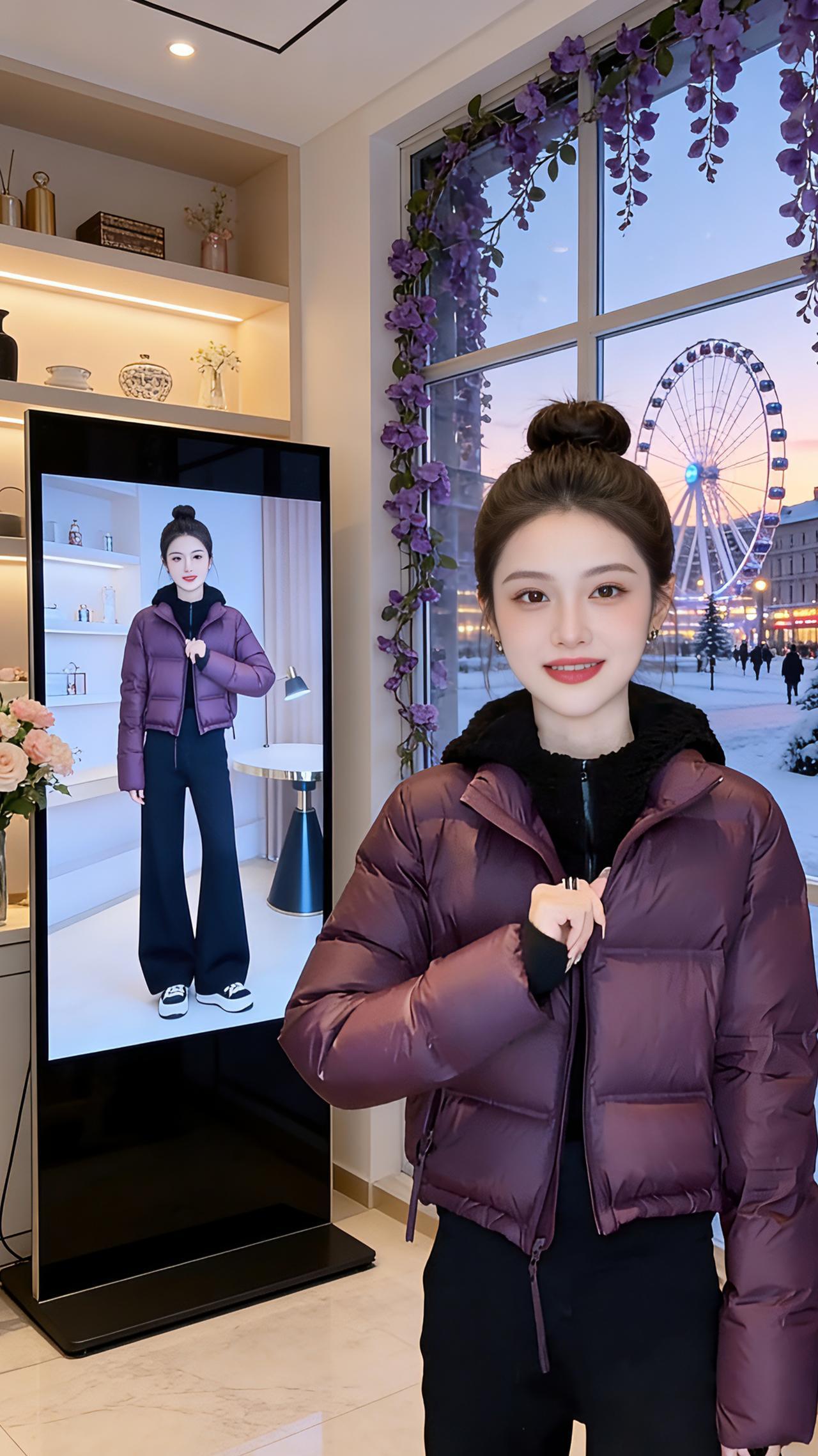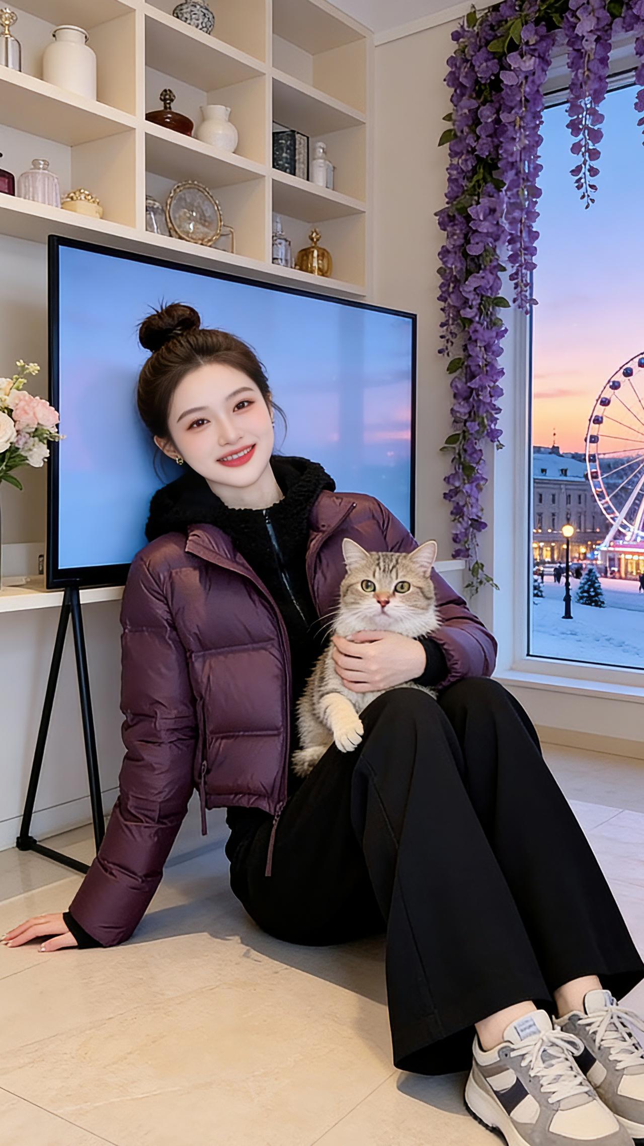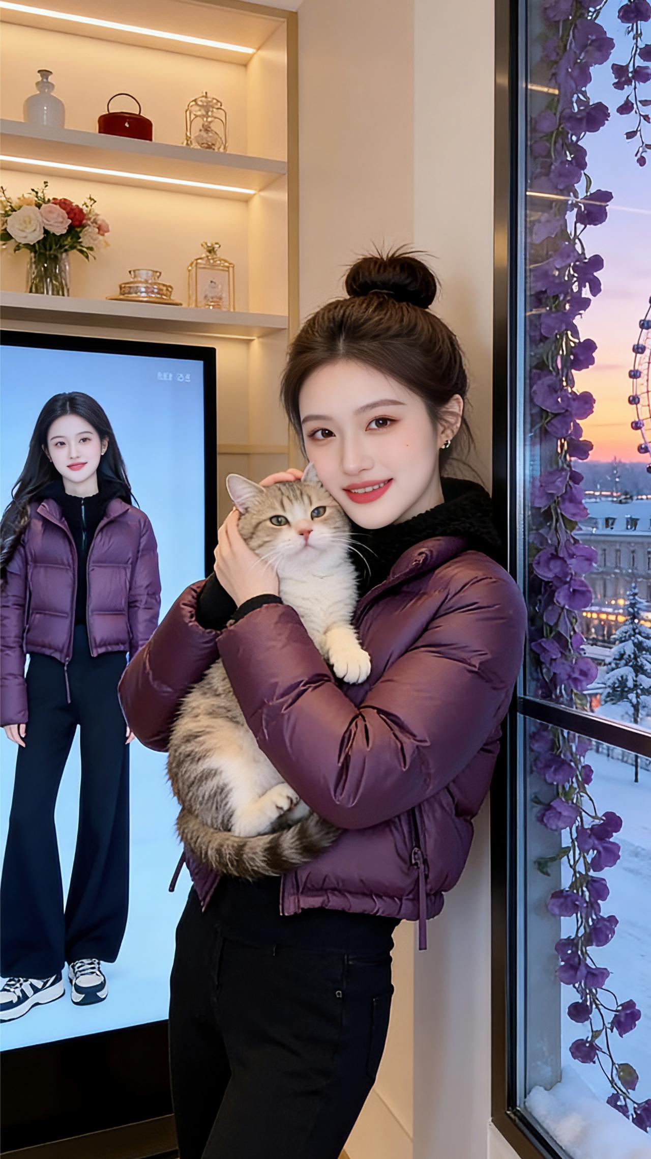 紫调冬日 深紫的羽绒衣裹着初冬的暖,像将暮色揉进了衣料,在室内暖光里漾开温柔的光泽。我抱着软乎乎的猫咪,它琥珀色的眼瞳里映着窗边垂落的紫藤,倒像是把窗外的雪色冬景也圈进了这一方小天地。 电视屏里映着同款的紫衫与自己,镜花水月般叠着影,倒叫人分不清哪一个是实景,哪一个是镜中相。转身抱过一束玫瑰,浅粉与淡紫的花瓣挨挤着,香氛混着室内的暖,漫出甜软的气息。 窗外是雪覆的街,摩天轮转着橘色的光,窗内是紫调的暖,猫咪的爪搭在我腕间,绒绒的,温温的。原来冬日的美好,从不是凛冽的寒,而是这样一隅被紫色温柔包裹的、藏着花香与猫语的暖。 高级感穿搭 小个子穿搭 冬季穿搭 棉服