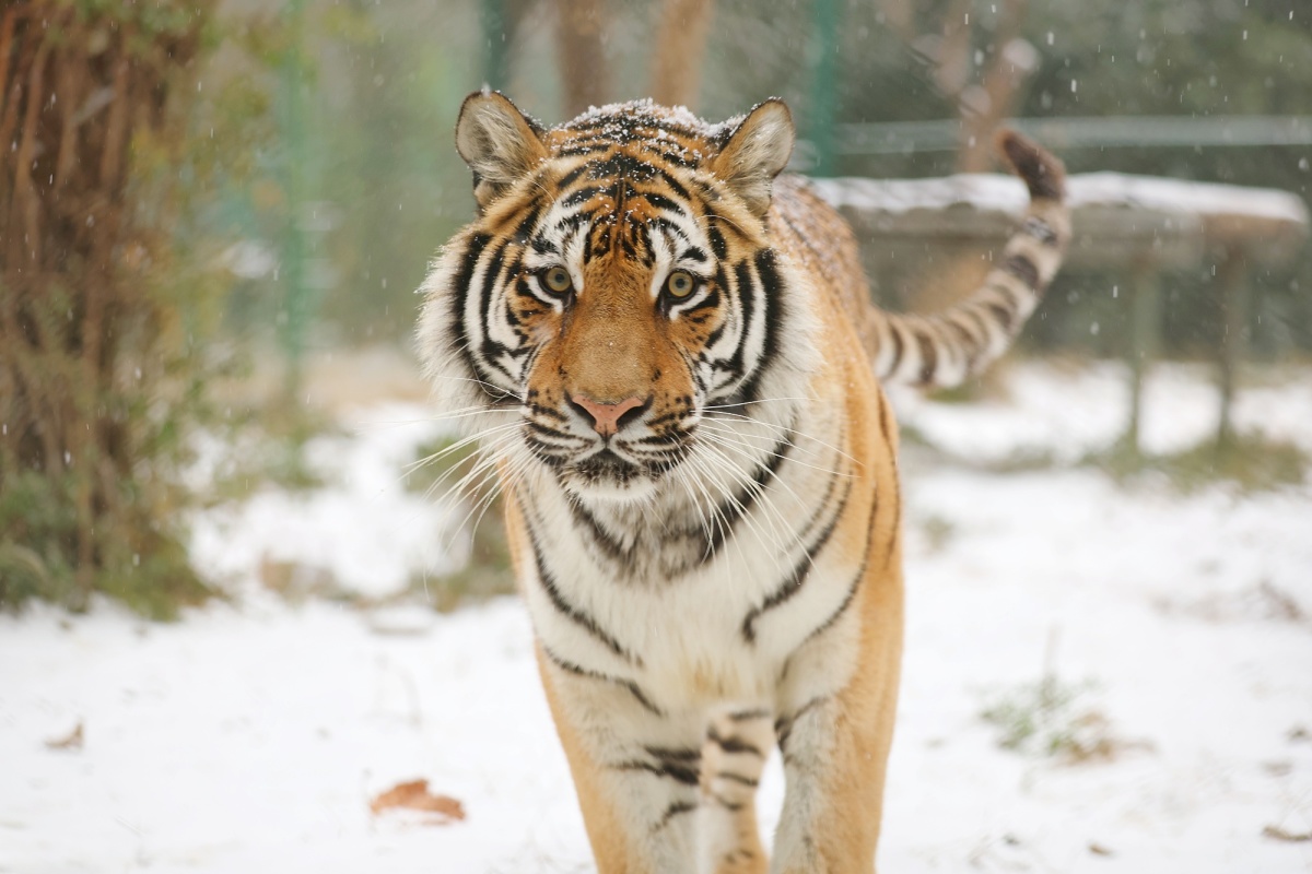 虎区,威风凛凛的大老虎们则迈着沉稳的步子踱来踱去,东北虎金黄色的皮毛上布满黑色横纹,细碎的雪花落上去,黑白金三色交织,愈发衬得它们身姿矫健、气势慑人。