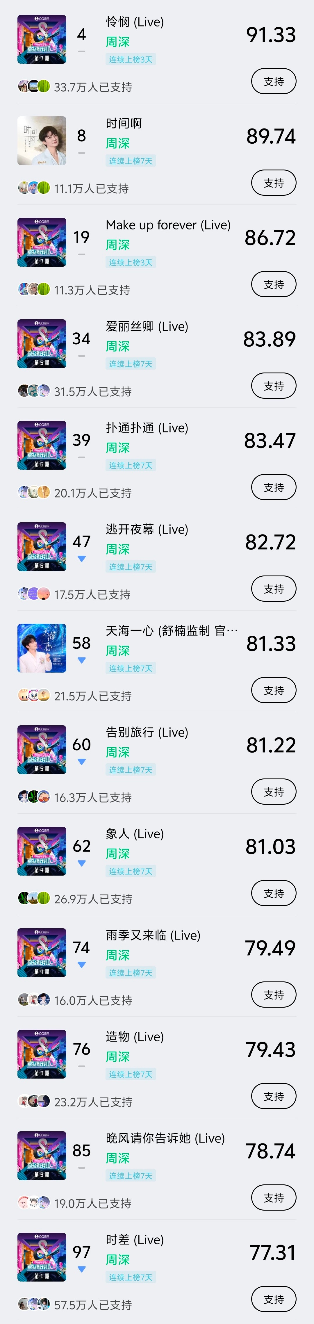 周深 📣 12.12 巅峰潮流 📣米米们晚上好每歌做6个动作路径:Q音-乐馆-排行-潮流巅峰✅《怜悯(live)》✅《时间啊》✅《Make up forever(live)》✅《爱丽丝卿(live)》✅《逃开夜幕(live)》✅《扑通扑通(live)》✅《象人》✅《天海一心(live)》✅《告别旅行(live)》✅《造物(live)》✅《雨季又来临(live)》✅《晚风请你告诉她(live)》✅《时差(live)》完成『支持』让更多人听到深深