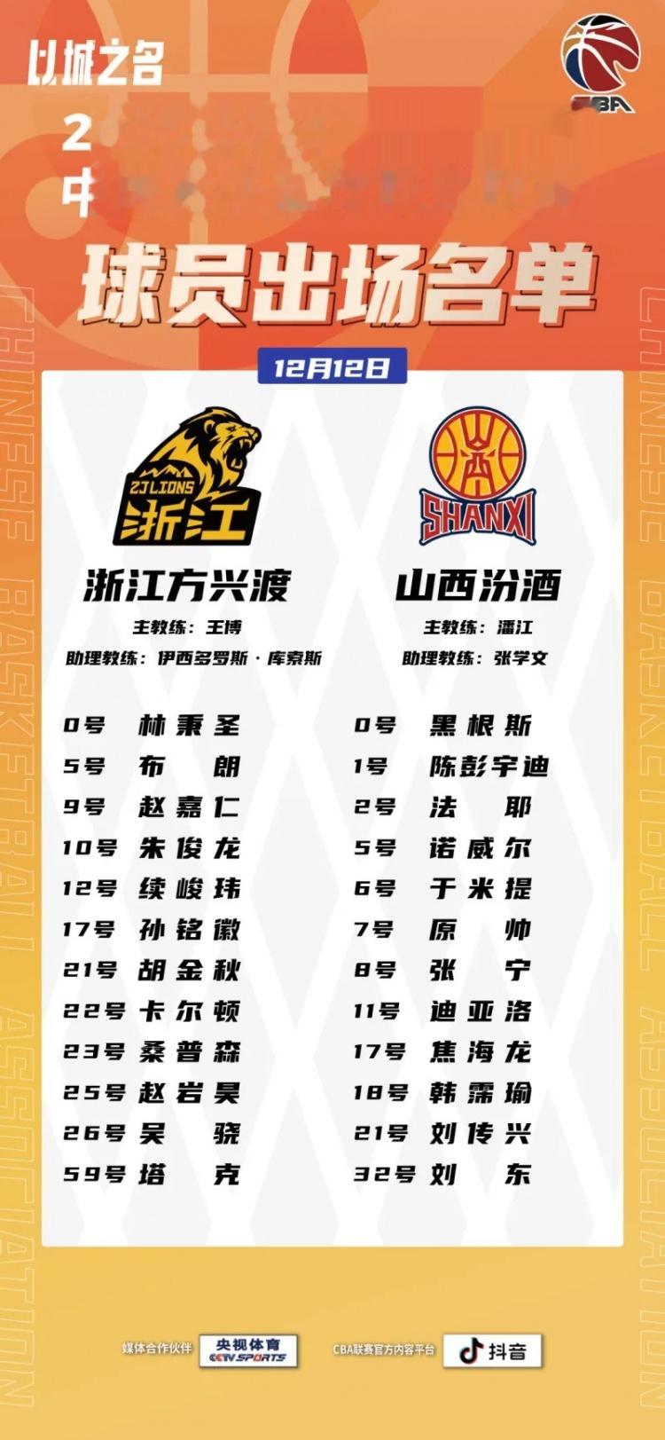 直播吧12月12日讯19点35分,新赛季CBA常规赛揭幕战广厦对阵陕西的比赛将开打,赛前官方公布了本场比赛两队的大名单。具体如下: