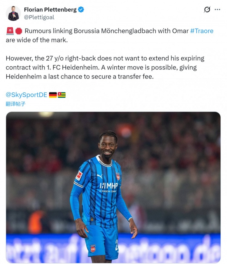 有媒体称门兴希望引进27岁边卫奥马尔·特劳雷,但普莱滕伯格指出,这一传闻毫无根据。不过奥马尔·特劳雷的合同2026年到期,他并不想与海登海姆续约,球员可能在冬窗转会,因为这是海登海姆从他身上获得转会费的最后机会。