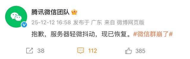 刚刚,@腾讯微信团队发布公告称,“抱歉,服务器轻微抖动,现已恢复。”