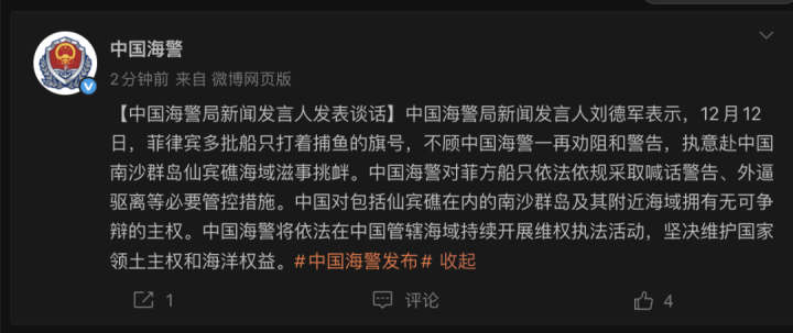 中国海警局新闻发言人刘德军表示,12月12日,菲律宾多批船只打着捕鱼的旗号,不顾中国海警一再劝阻和警告,执意赴中国南沙群岛仙宾礁海域滋事挑衅。中国海警对菲方船只依法依规采取喊话警告、外逼驱离等必要管控措施。中国对包括仙宾礁在内的南沙群岛及其附近海域拥有无可争辩的主权。中国海警将依法在中国管辖海域持续开展维权执法活动,坚决维护国家领土主权和海洋权益。