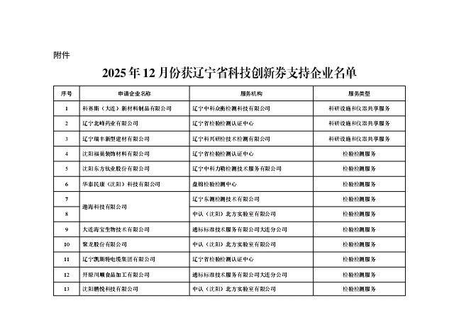 根据《辽宁省科技创新券管理办法(试行)》《辽宁省科研基础设施和科研仪器开放共享服务科技创新券实施细则(试行)》等有关规定,经有关单位申报、初审推荐、复审核查、辽宁省科技厅党组会审定等程序,日前,省科技厅对2025年12月份获辽宁省科技创新券支持的13家企业名单进行公示。