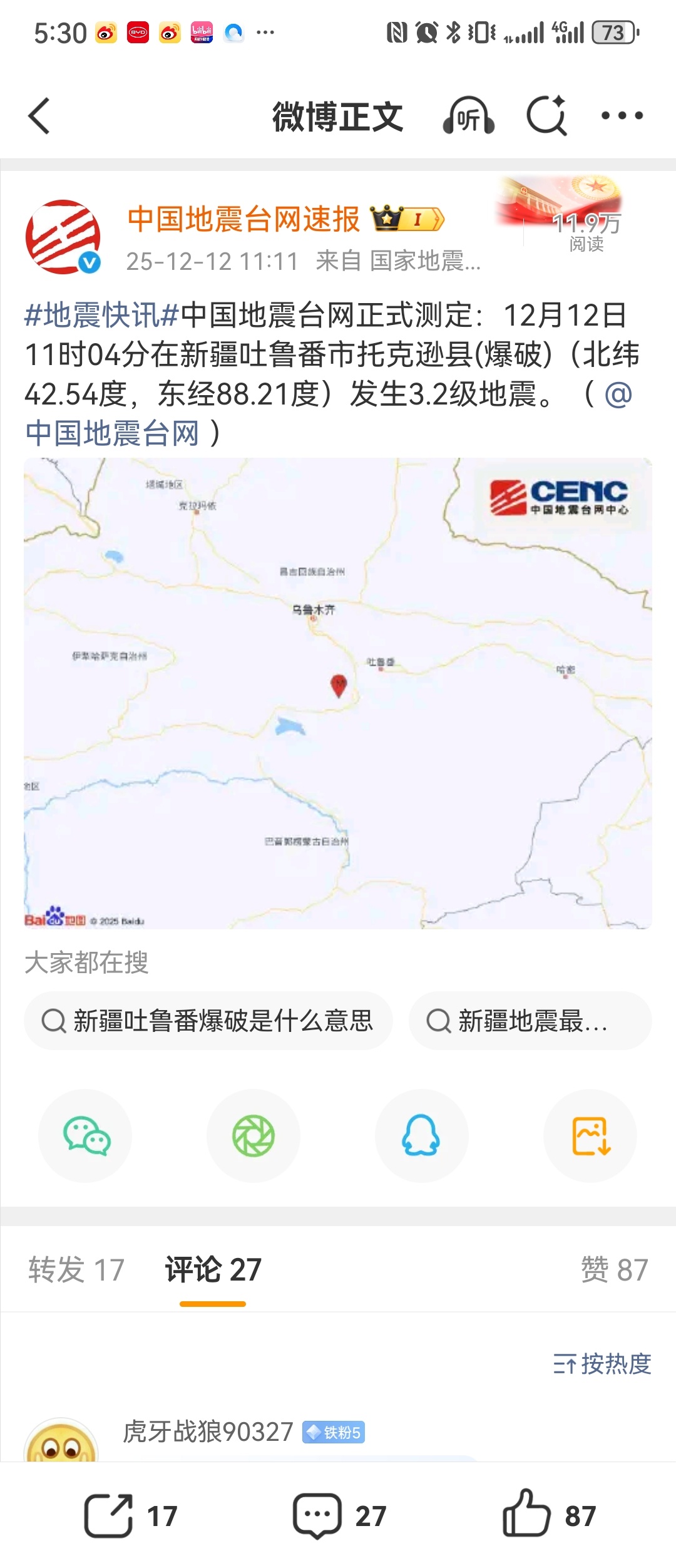 新疆吐鲁番市托克逊县发生3.2级地震(爆破)啥意思?!热点现场