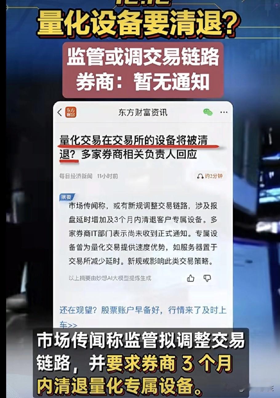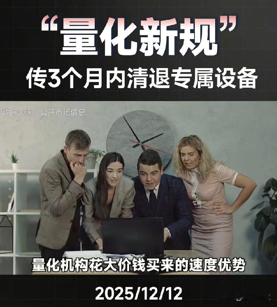 炸了! “量化新规”传3个月内清退专属设备!做量化交易,以速度取胜的要凉凉了吗? 当我们散户和量化基金交易速度是一样的时候,量化基金的优势就没有了。对于a股市场来说是个大大的利好!量化资金助长杀跌,不利于价值投资,助推市场大涨大跌。 虽然只是传闻还没有落地,但是小范围消息传的满天飞。对中低频、基本面量化影响有限。