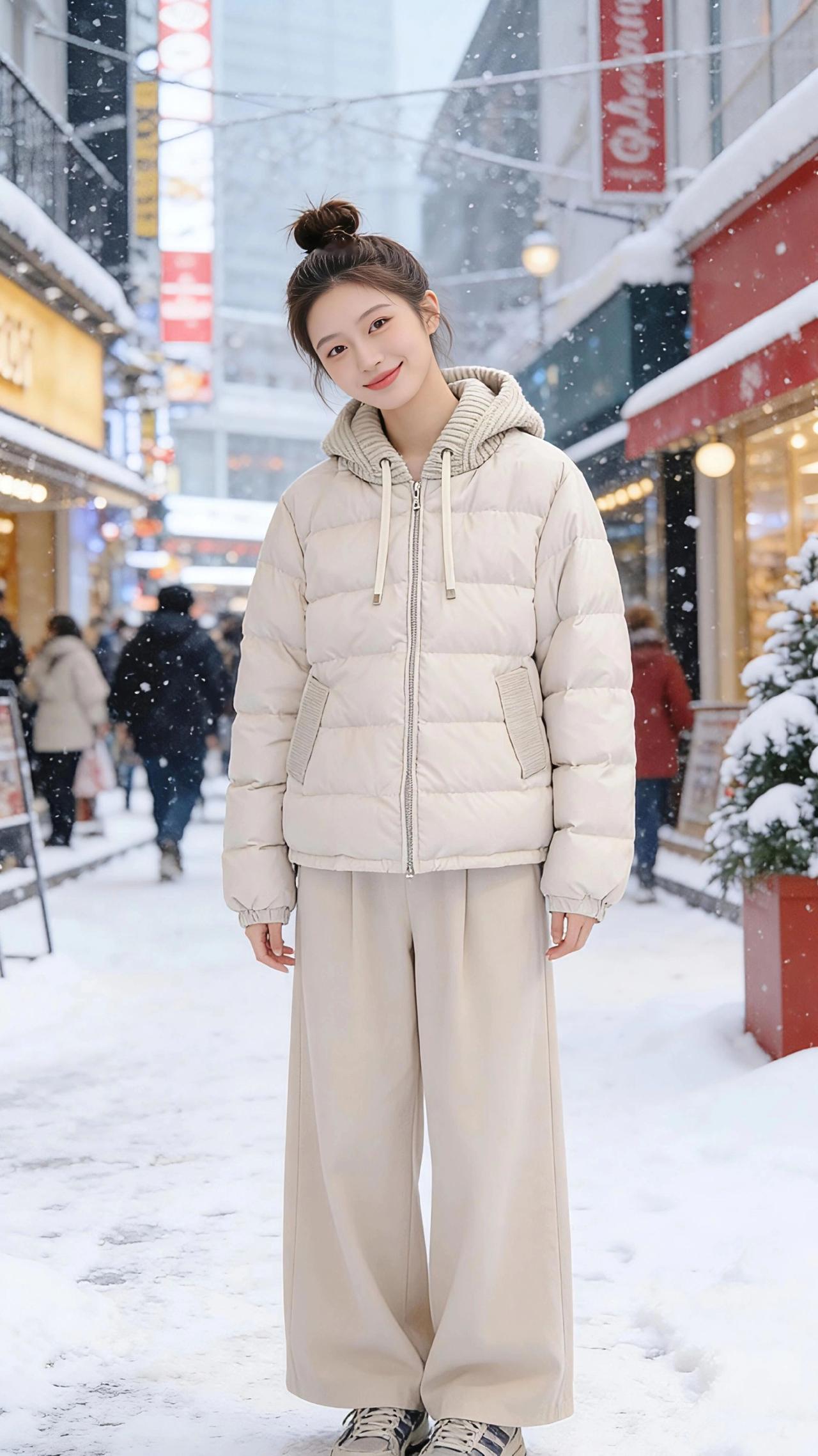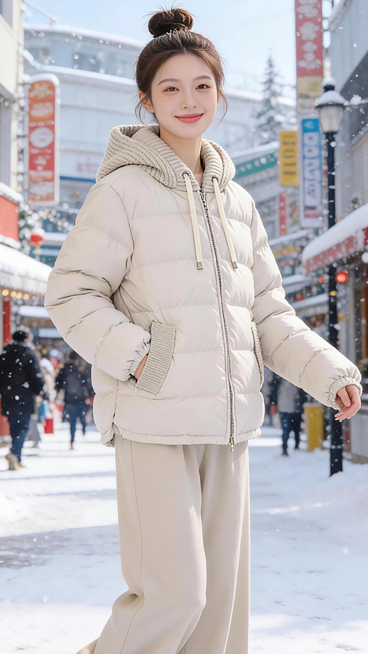 暖白映雪 雪絮悠悠落满商业街的檐角,将斑斓的招牌晕上一层软白,行人的脚步踩在薄雪上,碾出细碎的声响,热闹却不喧嚣。 她站在这片雪色里,米白色的羽绒服像裹了一团温柔的云,针织连帽的纹理摩挲着脖颈,蓬松的菱格纹路在雪光下泛着柔和的光泽。同色系的阔腿裤垂坠着,与脚下的运动鞋相衬,添了几分随性的慵懒。棕色丸子头挽得俏皮,几缕碎发被雪风拂在颊边,衬得皮肤白如凝雪。浅红的唇瓣弯起,明亮的眼妆里盛着笑意,像冬日里破开云层的暖阳,轻轻撞开了寒意。 她单脚踮起时,羽绒服的弧度晃出软乎乎的可爱;双臂交叠站定,又透着几分利落的娇俏;手插口袋时,眉眼弯弯望向镜头,笑意漫进眼底,仿佛把街边的烟火气都揉进了温柔里。雪还在飘,落在她的肩头,融在她的笑里,那抹干净的米白,成了冬日街头最熨帖的风景,像一杯温吞的热奶茶,暖了风雪,也暖了路过的时光。 高级感穿搭 冬季穿搭 棉服外套 羽绒服穿搭