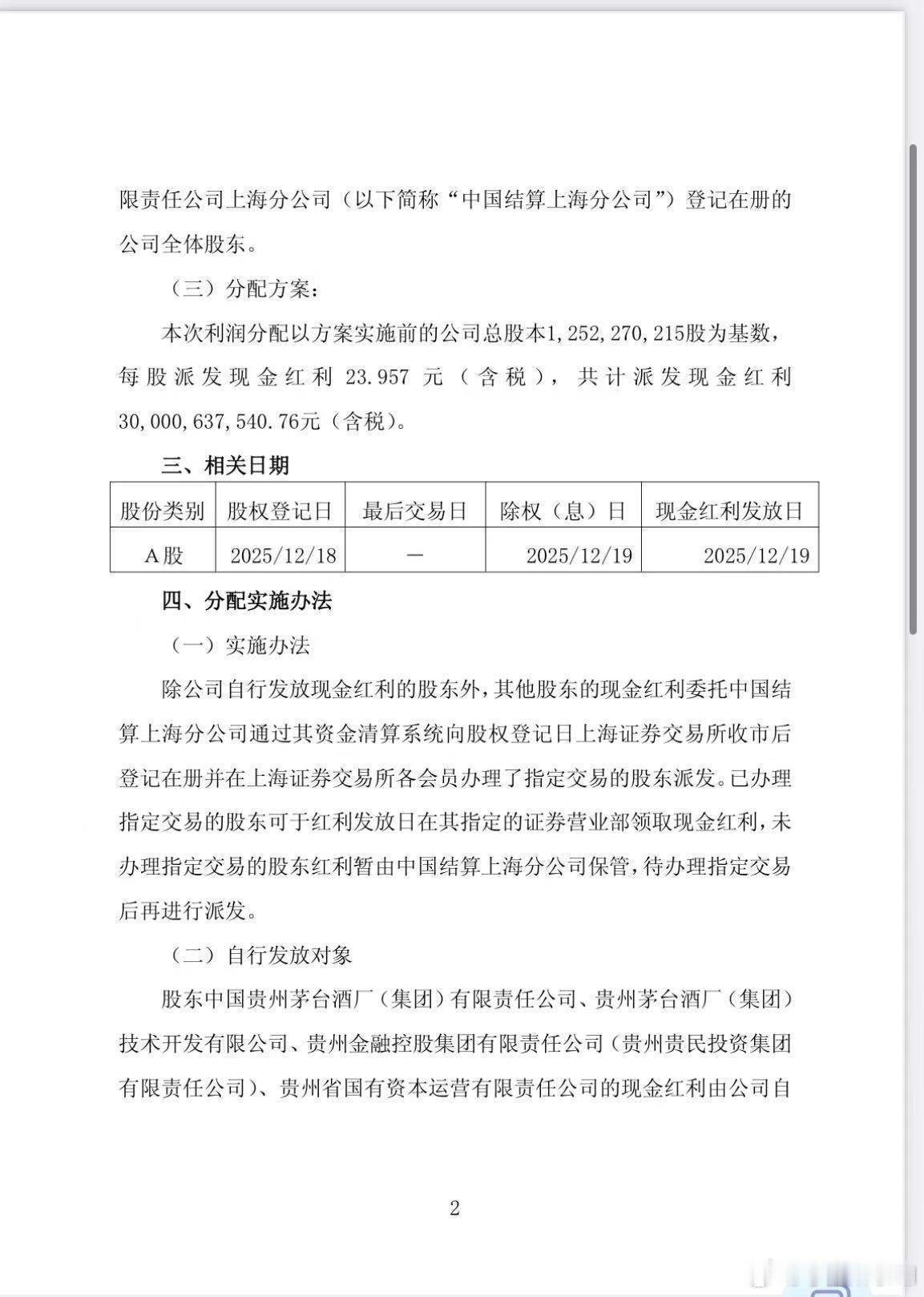 贵州茅台2025年中期分红,每股分红23.957元。股权登记日:12/18/2025;除权日:12/19/2025周五
